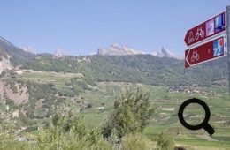 Bis Sierre, unserem heutigen Ziel, ist die Rhone begradigt und mit Damm gesichert. Dieser wird sehr gut durch Radler mit und ohne Gepäck genutzt. Wir haben weitgehend Schatten und fahren kilometerweit stur geradeaus über den Damm, teils an großen Obstfeldern entlang. Aprikosen, Äpfel, Birnen und Kirschen, hier wächst alles in Massen.