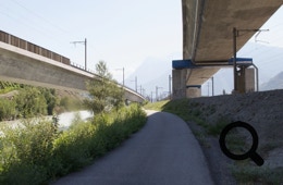 Nach einiger Zeit fahren wir über eine Anliegerstraße unter lauter Bahnhochtrassen hindurch. Der Weg wird zur Schotterpiste und führt bis Baltschieder neben der Bahn her. Von dort haben wir nur noch ein paar Kilometer im prallen Sonnenschein zu fahren, bevor wir überhitzt und fertig das Thermalbad & Camping Brigerbad erreichen.