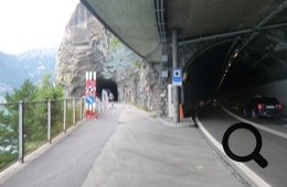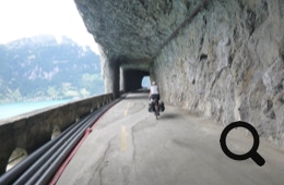 Wir setzen uns auf die Räder und fahren über die Axenstraße in Richtung Brunnen. Ein Schild warnt Radfahrer, doch lieber Zug oder Schiff zu nehmen, da die vielbefahrene Hauptstraße zu gefährlich sei. Ist sie aber eigentlich nicht, es geht meist auf einem Radweg, manchmal sogar separat ein Stück über die alte Axenstraße. An einer Engstelle hilft uns ein Baggerführer dabei, unsere Räder an seinem Fahrzeug und der Baustelle vorbei zu bugsieren.
