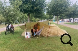 Nach dem Spülen sind wir so durchnäßt (es sind schon ein paar hundert Meter Weg zum Sanitärgebäude), daß wir uns ins Zelt zurückziehen, wo es muckelig warm ist.