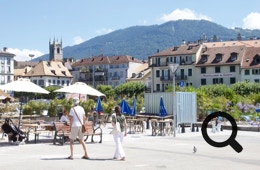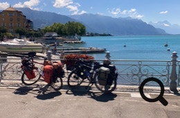 In Vevey stoppen wir am See und genießen den Blick auf die prächtige Stadt, den See und die vielen Menschen.