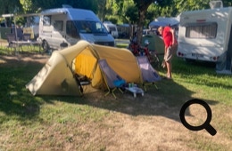 Wir bedanken und verabschieden uns und radeln dann am Seeradweg entlang. Der erste Campingplatz hat ein großes „voll belegt“-Schild draußen angebracht, also fahren wir noch etwas weiter zum Camping „Solitaire du lac“. Dort sind wir die ersten in der Warteschlange und bekommen einen schönen Platz für zwei Nächte.