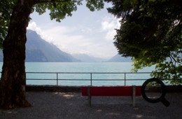 Am Vormittag gehen wir ein wenig am See spazieren, es ist schon wieder sonnig. Auf einer schattigen Bank mit Seeblick läßt es sich aushalten.
