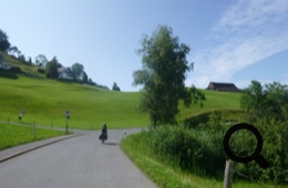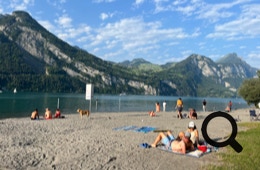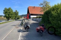 Es geht lang und steil hinunter und wir brauchen mehrere Pausen, um die Bremsen zu kühlen. Bis Siebnen rollen wir über die Hauptstraße, dann geht es weiter über Radwege durch die Linth-Ebene. Schier endlose, ebene Wege führen durch die Felder und Wiesen bis zum Camping im Wald bei Weesen, wo wir einen schönen Waldplatz für unser Zelt bekommen. Abendessen gibt’s im Camping-Beizli, weil Sonntag ist.