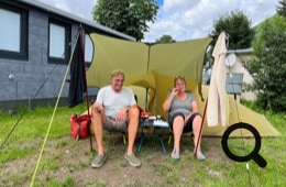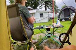 Es hat die ganze Nacht geregnet. Wir nutzen eine kurze Regenpause, um unser Tarp neu auszurichten, so daß man vor dem Zelt sitzen kann, ohne naß zu werden.