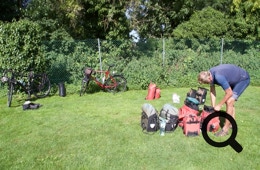 Wir stehen zwar früh auf, müssen aber bis neun Uhr warten, weil es dann erst Brötchen an der Rezeption gibt. Danach trödeln wir beim Abbauen ein wenig, da es schon so warm ist und wir Sabines neue Handyhalterung zusammenbauen und montieren müssen.
