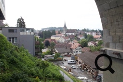 In der Nacht gewittert es, ununterbrochen blitzt und donnert es. Am Morgen muß Klaus zunächst mit dem Bus nach Düdingen, das reparierte Rad abholen. Der Transport des Gepäcks dorthin wäre zu kompliziert, also holt er erst das Rad und wir fahren dann gemeinsam und beladen über Düdingen nach Fribourg.