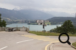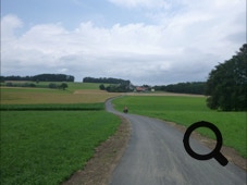 Über Marly geht es durch Felder und Hügel, kleine Dörfer, immer bergauf und bergab. Das ist landschaftlich hübsch, aber anstrengend. Wir können die Autobahn Basel - Genf die ganze Zeit sehen und hören, bewegen uns aber oberhalb und sind dann auch bald am Lac de la Gruyère.