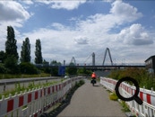 Als wir in Leverkusen auf die A1-Brücke über den Rhein wollen, führt uns die ausgeschilderte Umleitung einen kilometerlangen Umweg um den Neulandpark herum. Auf der anderen Rheinseite angekommen, führen uns weitere Umleitungsschilder zunächst in die Irre, bevor wir dann einen eigenen Weg nach Merkenich finden.
