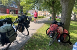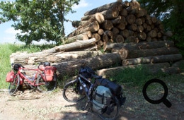 Als wir losfahren wollen, bemerken wir, daß Sabines bereits gehandicapte Packtasche einen weiteren Schaden, diesmal an der Befestigung, erlitten hat. Wir bekommen das provisorisch geregelt, aber um einen neuen Satz Packtaschen vor der nächsten Radreise wird Sabine wohl nicht herumkommen.