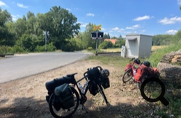 Wir suchen nun einen Ort zum Pausieren und Proviant vertilgen, den wir endlich an einem Sportplatz neben der Straße finden. Hier überlegen wir auch, wo wir heute übernachten werden, es gibt mehrere Perspektiven. Eine bereits gebuchte Pension stornieren wir, weil es dort kein Restaurant und kein Frühstück gibt.