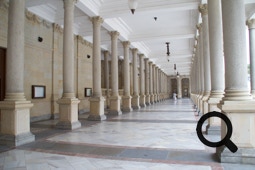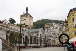 Unterwegs in die Innenstadt passieren wir kunstvolle Kolonnaden, das sind Wandelgänge, in denen die Quellen des heißen Heilwassers von Karlsbad zugänglich sind. Dort sind früher (und manchmal auch heute noch) Menschen mit Tassen voll Wasser nippend auf- und abgeschritten.