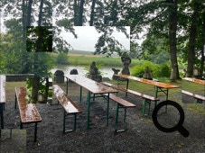 Gegen Abend kommt die Sonne noch einmal heraus und der platzeigene Biergarten füllt sich, zumal Fußball gezeigt wird. Wir genießen nach dem Abendessen die letzten Strahlen würfelnd am Zelt.