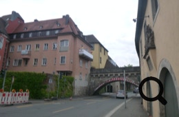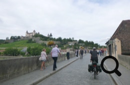 Zuerst fahren wir hinunter an den Main und überqueren ihn über die Alte Mainbrücke mit Blick auf die Burg. Nach ein paar Metern längs des Mains biegen wir ab und steigen auf nach Höchberg.