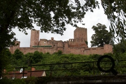 Beim Abbau trödeln wir, weil es recht warm ist und fahren erst gegen 10:30 Uhr in Richtung Zentrum Triefenstein. Dort müssen wir über die Brücke und dann mit 12 % Steigung die Straße hinauf zum Kloster. Dahinter geht es noch einmal aufwärts und dann in leichten Wellen über den Bergrücken. Schatten gibt es hier faktisch nicht.