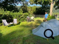 Das Wetter schlägt um, unsere App gibt uns noch eine halbe Stunde bis zum Dauerregen. In Collenberg überlegen wir, in einem Biergarten auszuharren, bis das Wetter wieder besser ist. Da das aber locker noch zwei Stunden dauern kann und hier auch ein Campingplatz ist, checken wir ein und bauen im Rekordtempo auf.