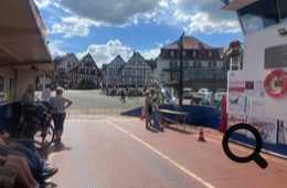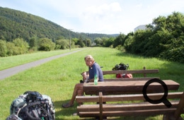 Zwischendurch machen wir kleine Päuschen u.a. in Obernburg, das ist im Odenwald. In Großwallstadt gönnen wir uns ein Radler und eine Portion Pommes im Biergarten am (komischerweise) geschlossenen Spaß- und Freizeitbad.