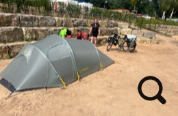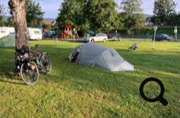 Der angepeilte Campingplatz liegt nur ca. vier Kilometer hinter der Fähre, aber dort ist scheinbar die Rezeption sonntags nicht besetzt. Ein Passant rät uns zum See-Camping, das ist 3,7 Kilometer weiter.