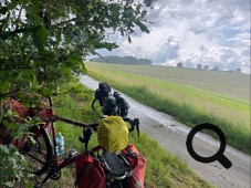 Als wir nach ein paar Kilometern auf die Straße kommen, geht es dort meist sonnig weiter vorbei an Höfen und durch Weiler. Zwischendurch stellen wir uns mal eine Zeitlang unter einen großen Baum, um einem stärkeren Regenschauer zu entgehen. Dann fahren wir wieder auf und ab durch Felder und kleine Ansiedlungen.
