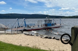 Auf 800 Metern Höhe führt eine Straße bergab zum Radrundweg am Lipno-Stausee. Am Fähranleger warten wir zusammen mit anderen Radfahrern auf die Fähre, die dann nach etwa zwanzig Minuten eintrifft. Die Überfahrt fühlt sich langsam an, aber es ist ja auch ein recht großer See.