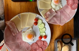 Der Wind ist weg, dafür kam in der Nacht Regen. Am Morgen ist es bedeckt und wir frühstücken im Campingplatzlokal. Das ist richtig gut und reichlich!
