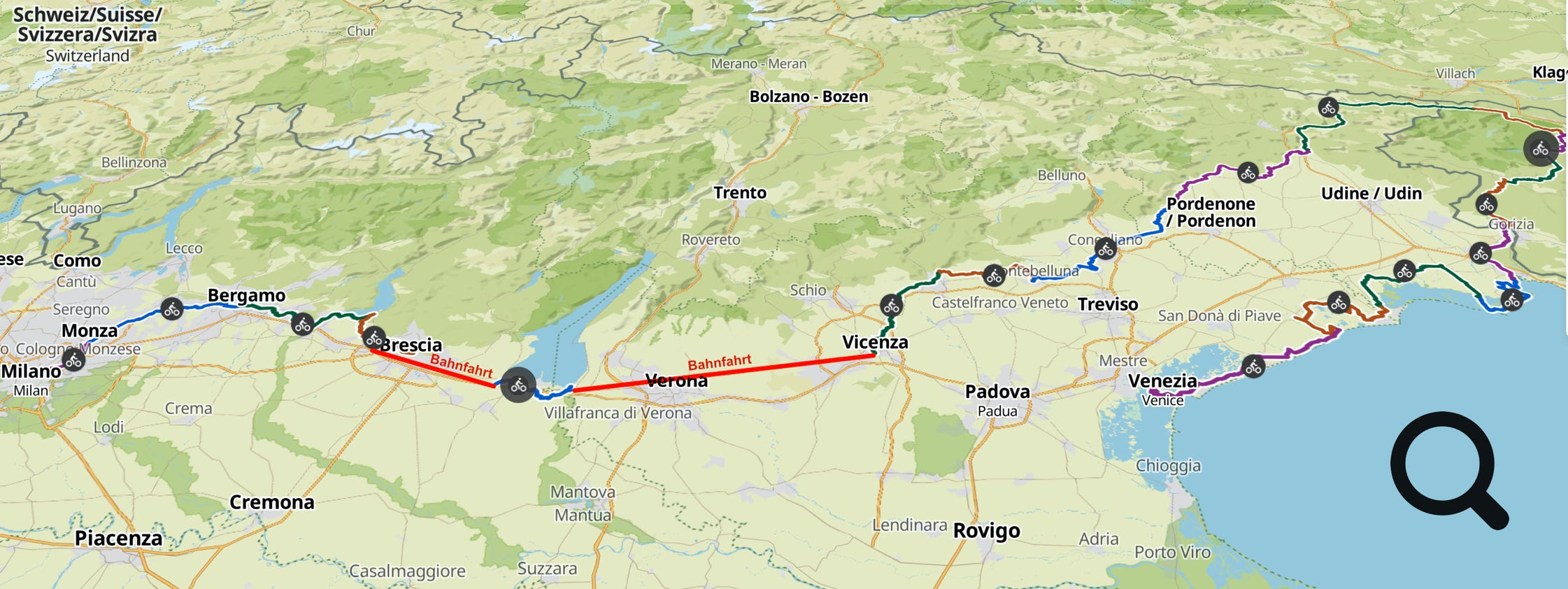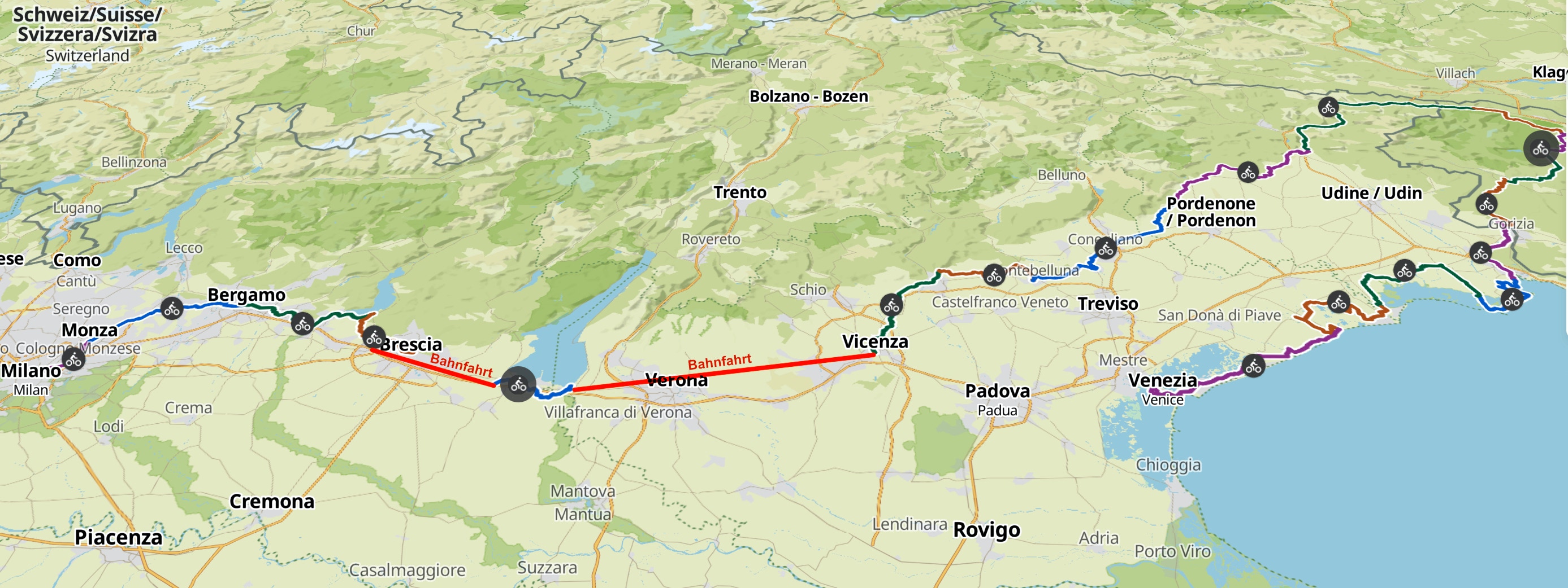 Sowohl in Norditalien als auch in Slowenien ist die Radweg-Beschilderung sehr gut. Hier wird auch viel mit dem Rad gefahren. Wir hatten in beiden Ländern trotz Hochsaison keinerlei Probleme, auf einem Campingplatz einzuchecken oder ein Hotelzimmer zu finden.