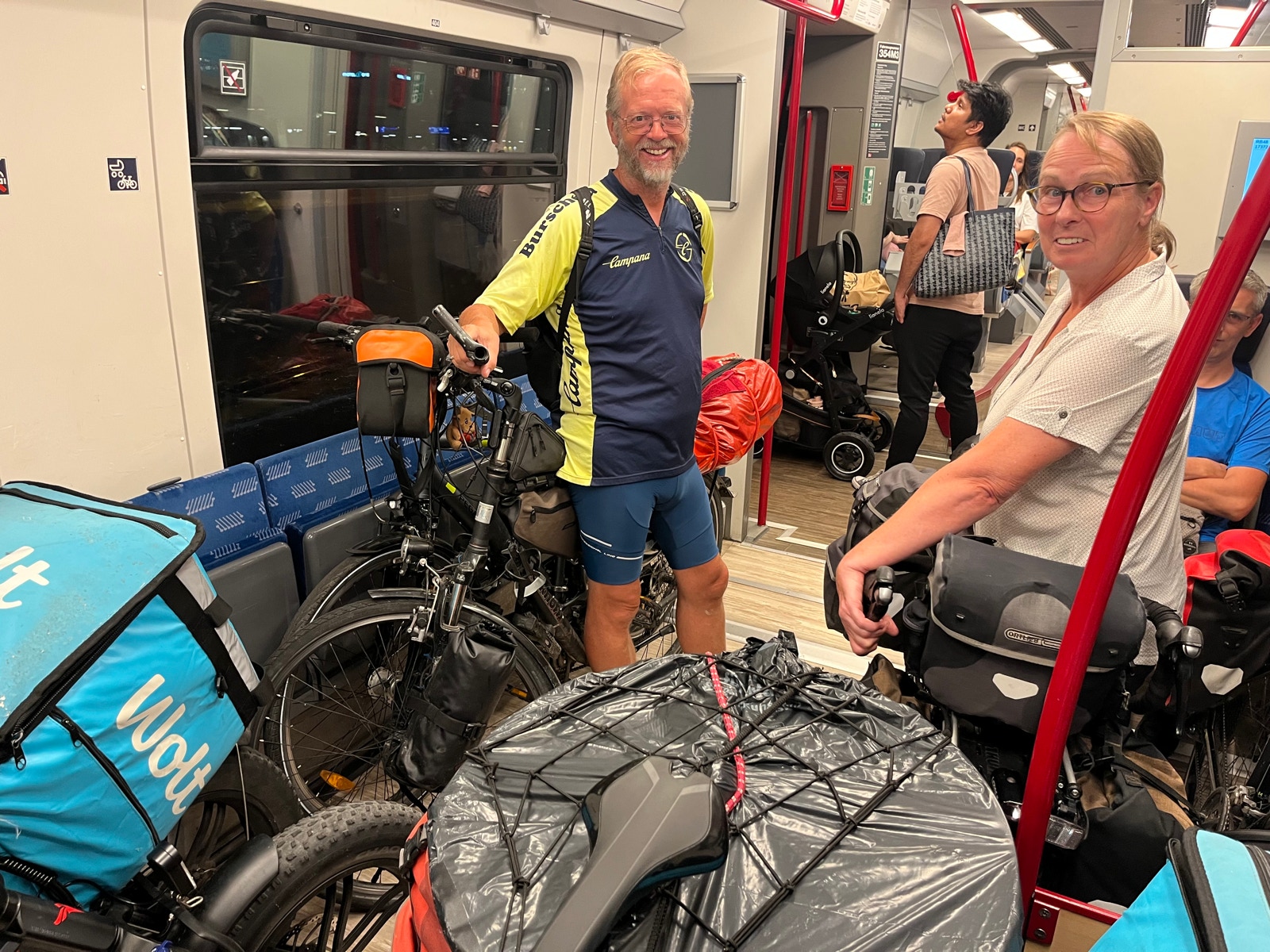 In Köln warten wir recht lange auf den RB48 und das Fahrradabteil ist mit uns und etlichen Uber-Eat-Rädern überfüllt. Gegen 23 Uhr verabschieden wir uns von Wolfgang, der noch eine Station weiterfährt.