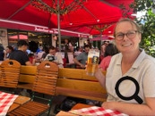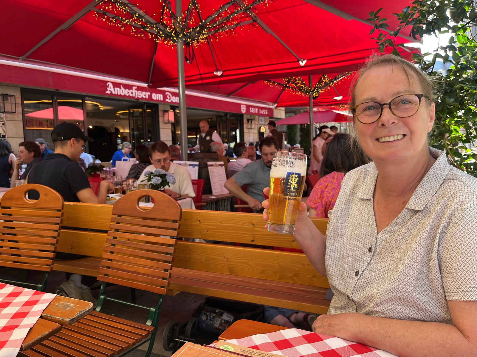 Wir gehen über den Stachus und dann an vielen gut besuchten Lokalen vorbei bis zur Frauenkirche. Dort finden wir im hellen, aber schattigen Biergarten „Augustiner am Dom“ ein schönes Plätzchen.