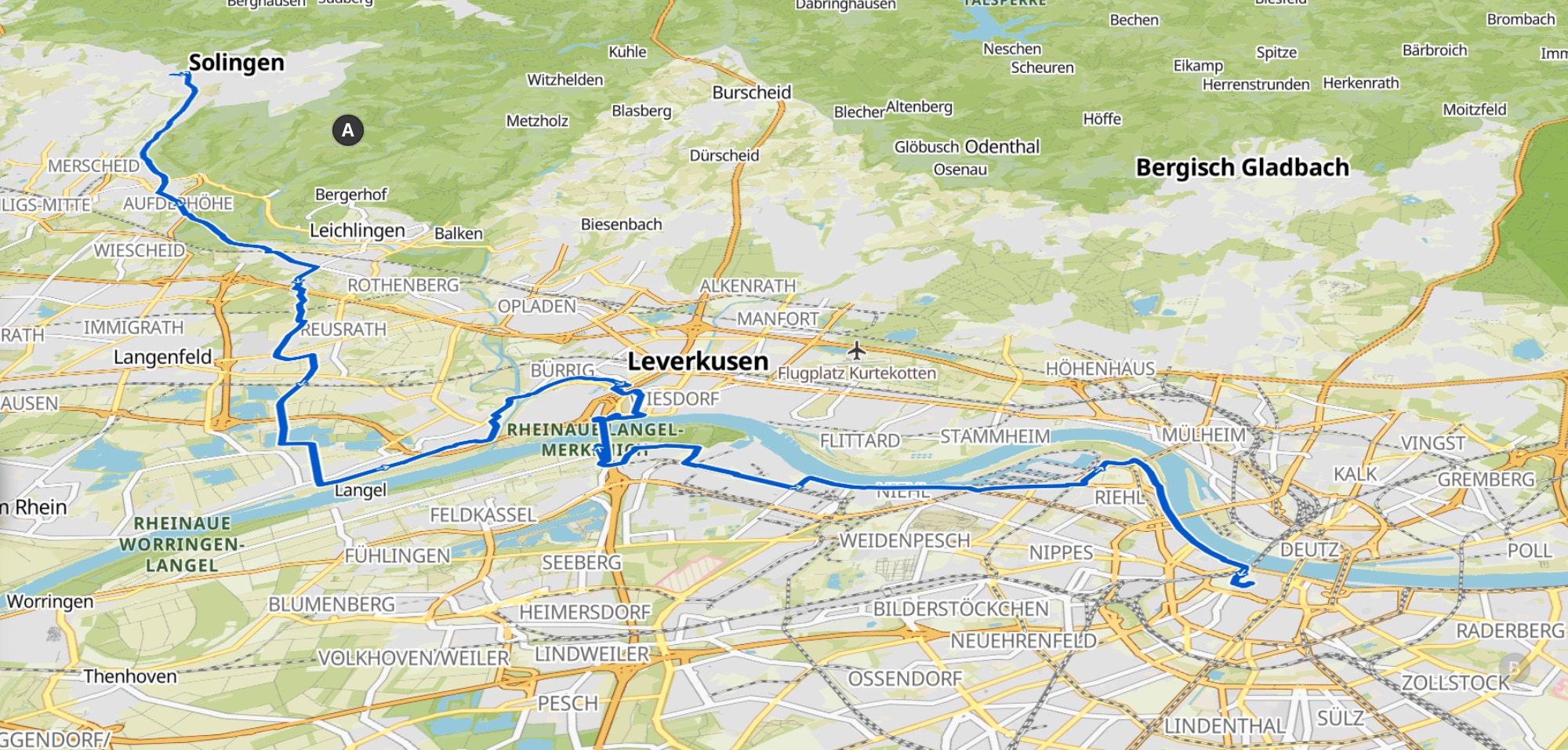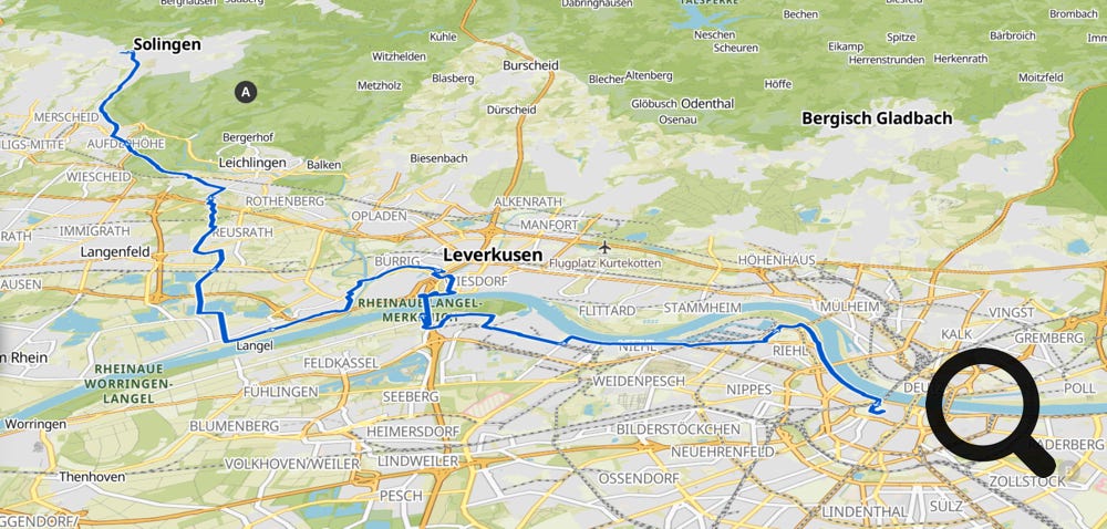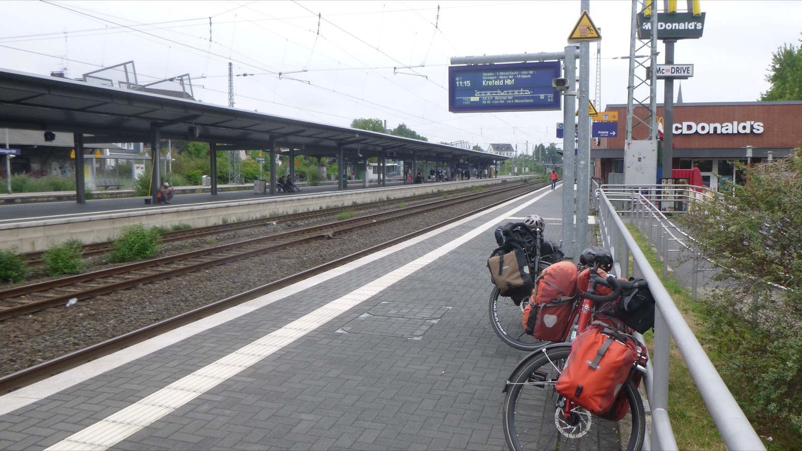 Es ist Sonntag. Morgens flitzen wir bergab nach Ohligs, der Zug kommt nur unwesentlich später als der Fahrplan verspricht. Der Einstieg erfolgt problemlos, unsere Reservierungen können wir wahrnehmen. Ausnahmsweise gibt es von uns deshalb ein Lob für die Deutsche Bahn.