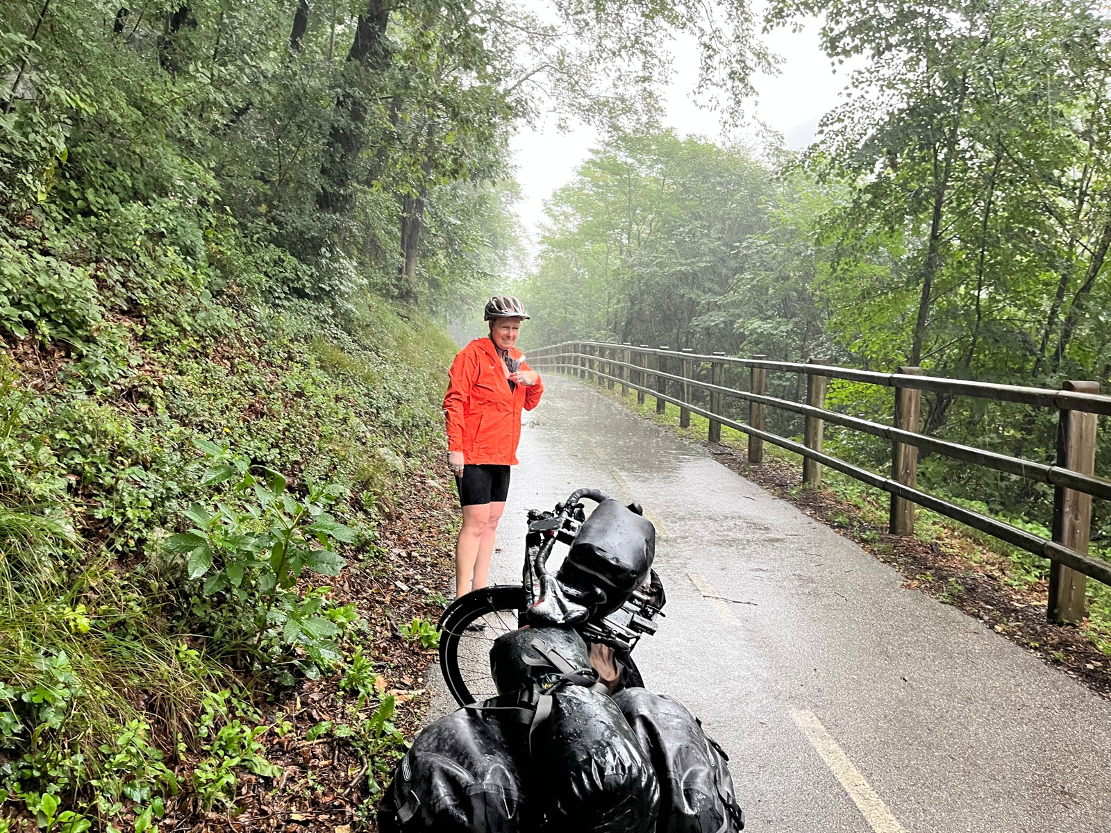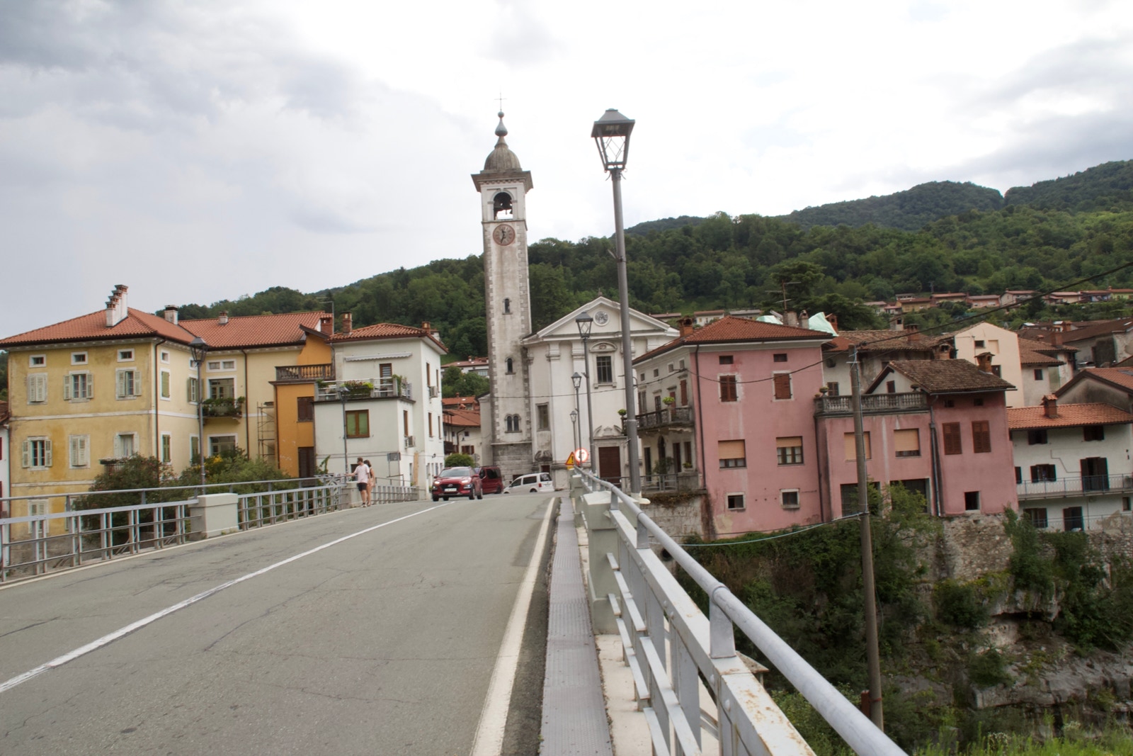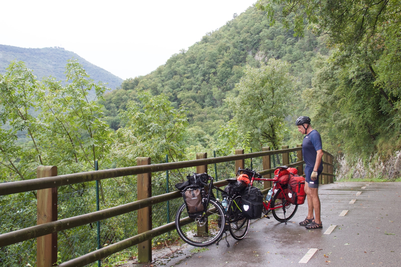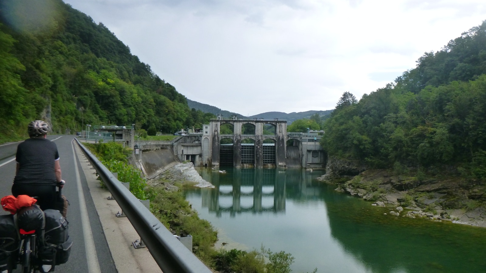 Eine Weile stellen wir uns unter Bäume, dann radeln wir einfach weiter durch den Regen. Leider ist in Plave der schöne Radweg zu Ende und es geht zunächst über wenig befahrene Nebenstraßen, dann über die Hauptstraße weiter.