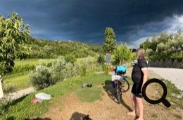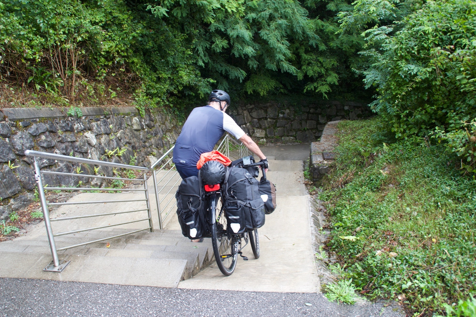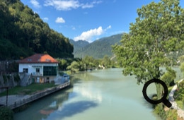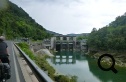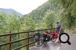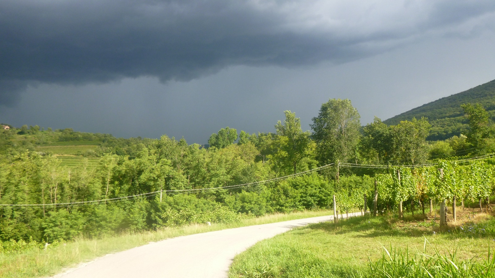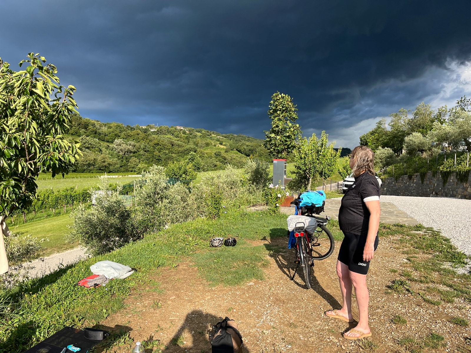 Eine Weile stellen wir uns unter Bäume, dann radeln wir einfach weiter durch den Regen. Leider ist in Plave der schöne Radweg zu Ende und es geht zunächst über wenig befahrene Nebenstraßen, dann über die Hauptstraße weiter.