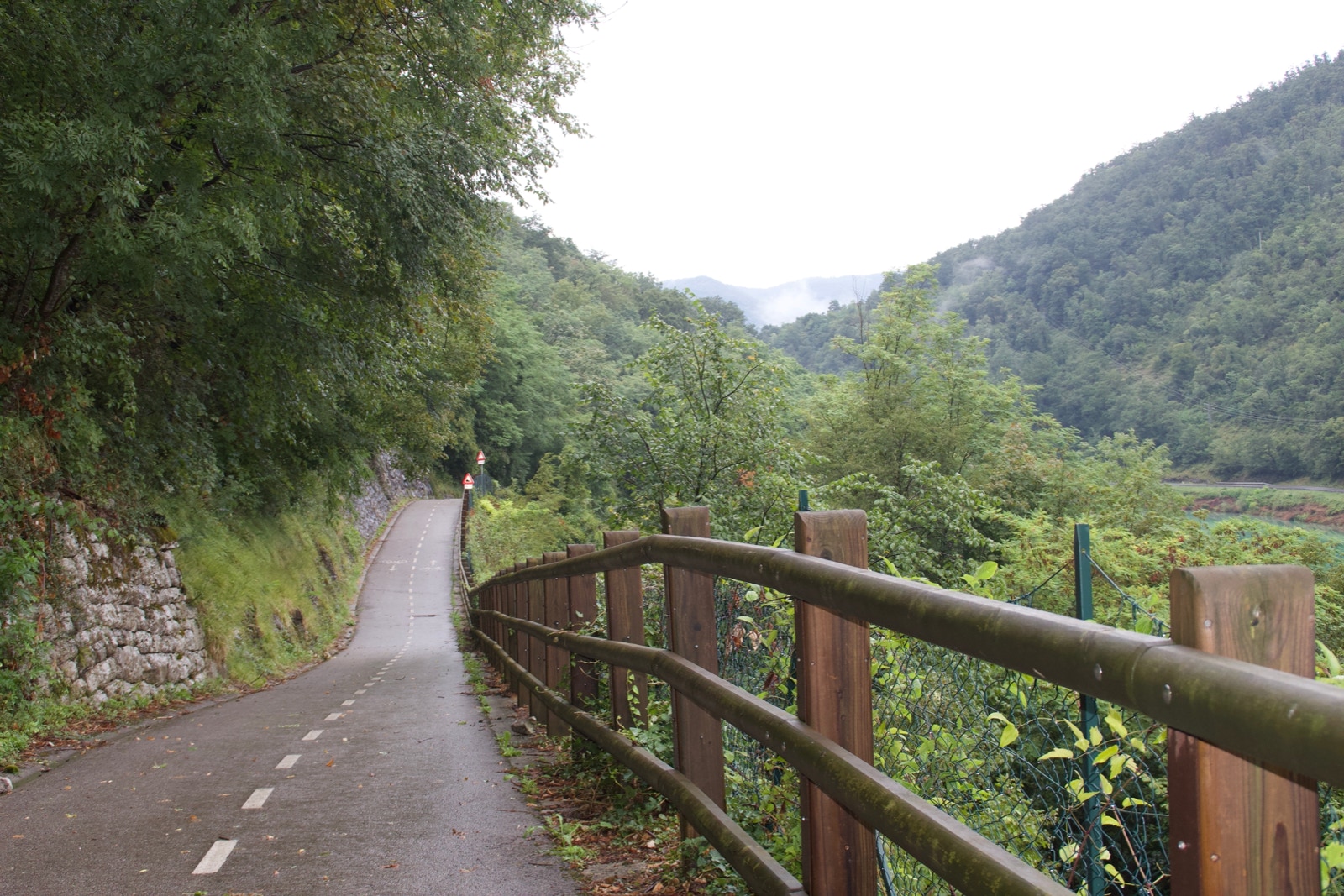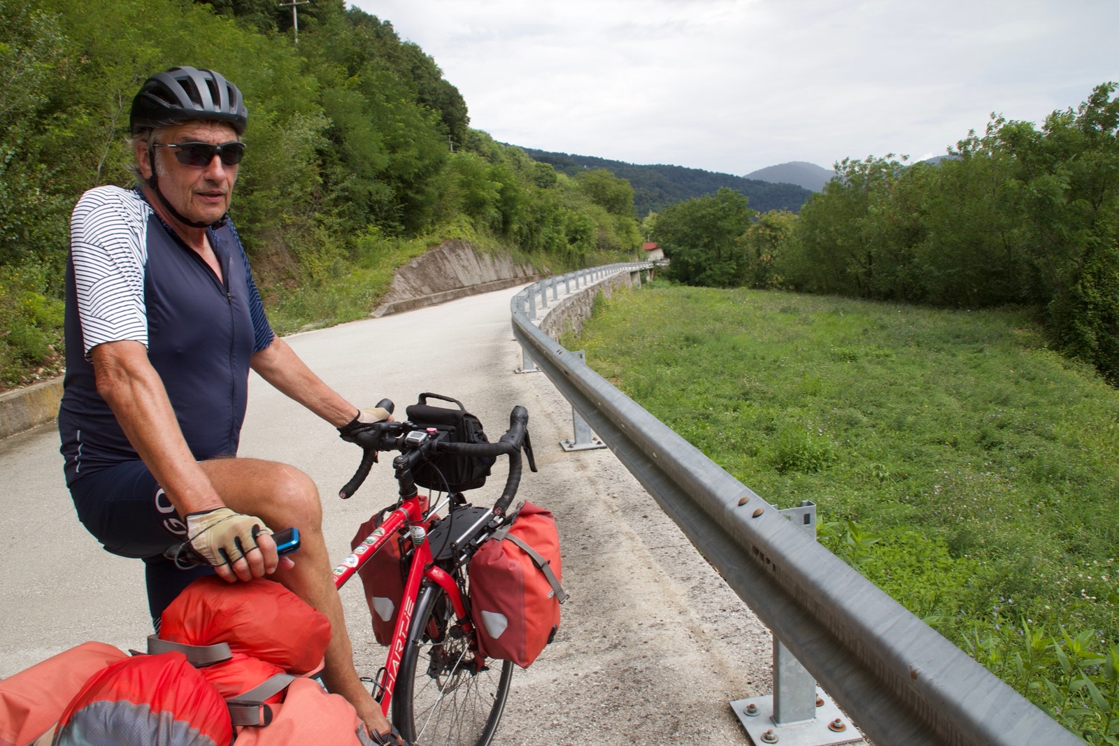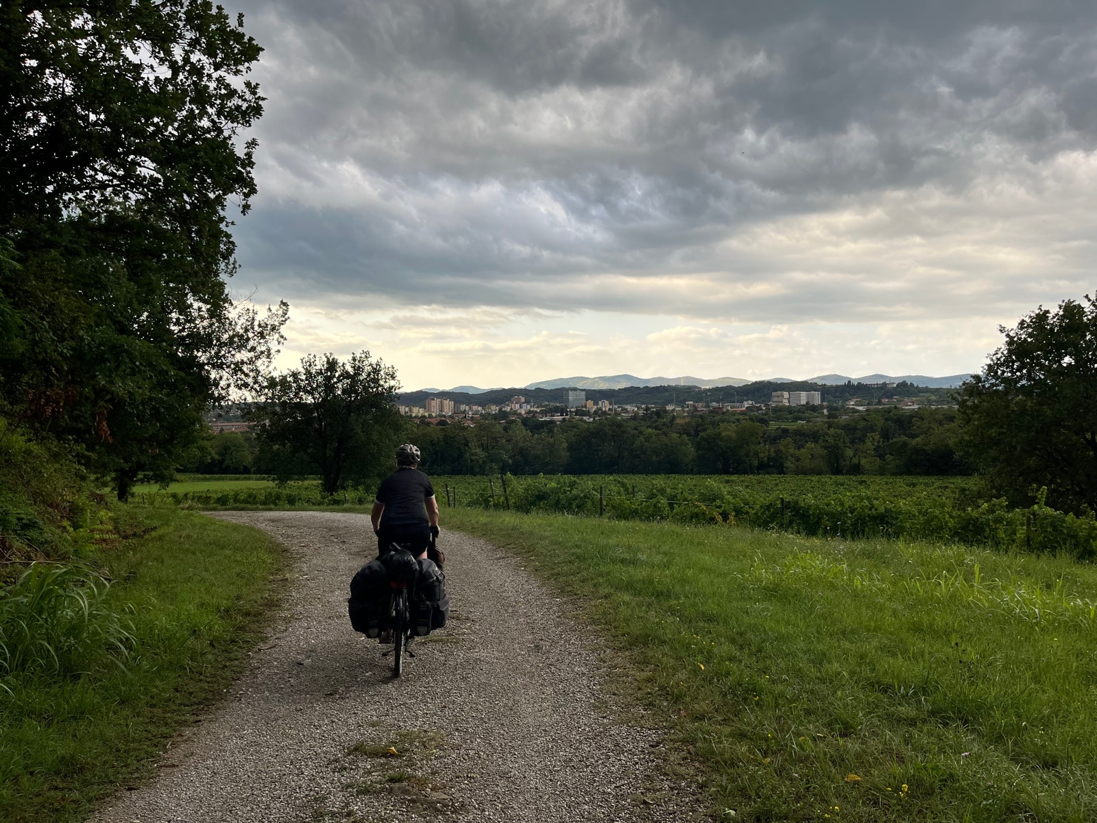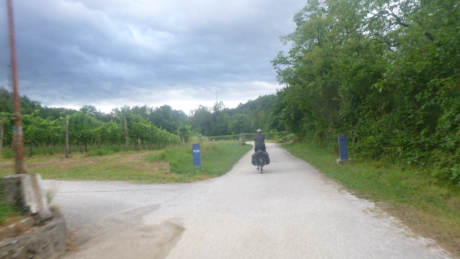 Es ist noch früh und durch den Regen gestern und die Bewölkung heute angenehm fahrbar. Der Radweg Richtung Plave ist schön angelegt und asphaltiert. Wir radeln ihn fröhlich entlang, als es leider anfängt zu regnen.