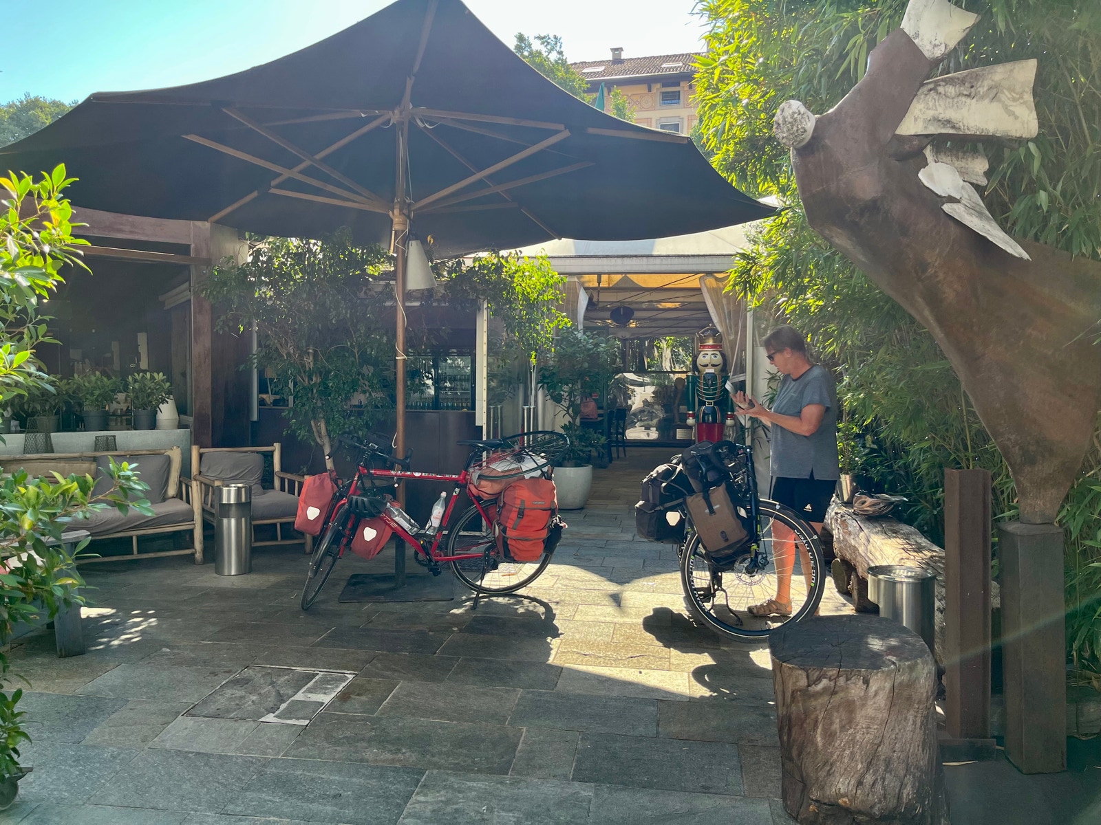 Da wir heute nur 17 Kilometer Etappe zu fahren haben und nicht vor 14 Uhr einchecken können, haben wir ordentlich Zeit zum Frühstücken. Es gibt eine große Auswahl an kunstvoll dekorierten Süßkram, Klaus wähnt sich im Paradies.