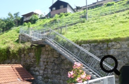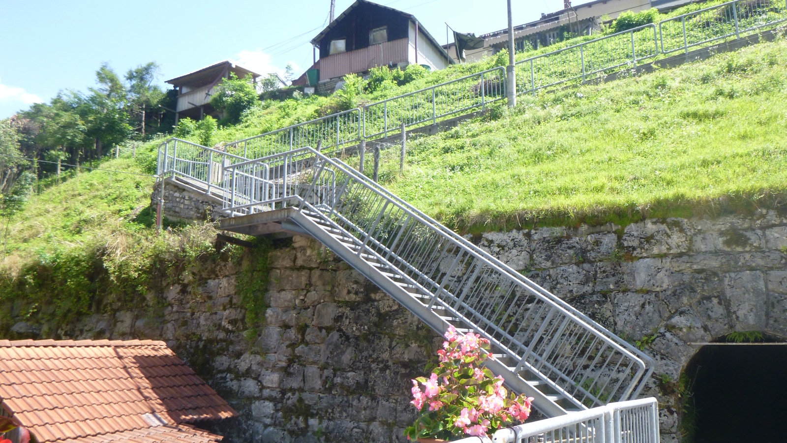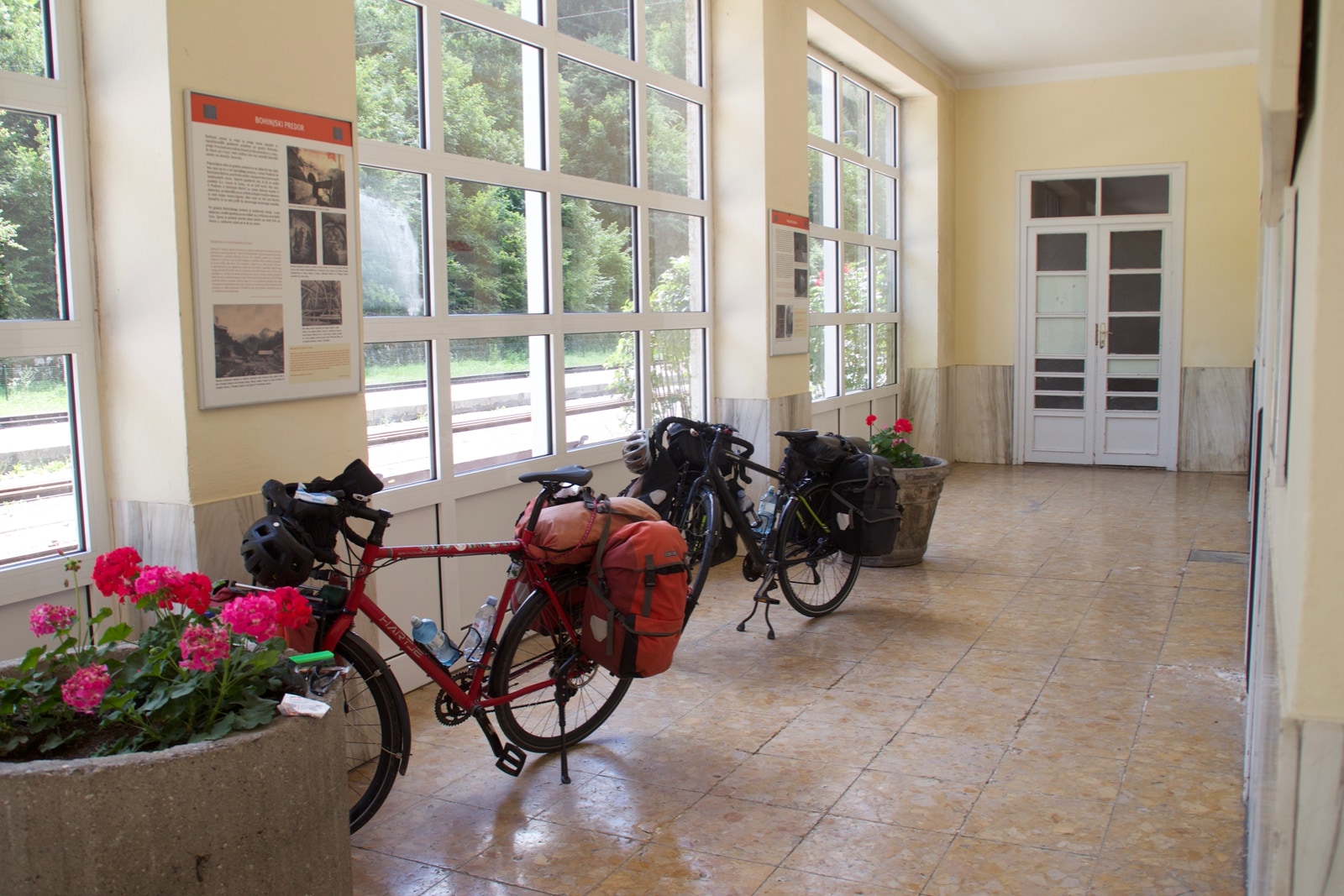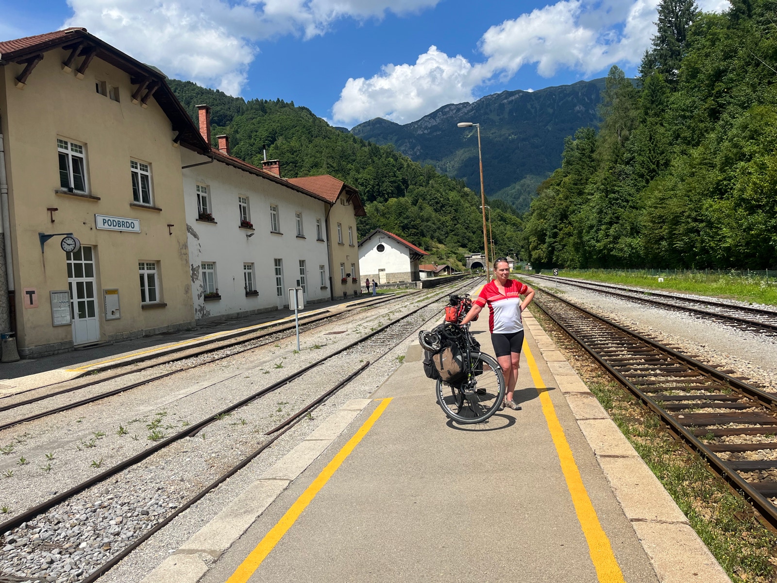 Am Bahnhof von Podbrdo kommen wir zwei Minuten zu spät an, wir können den Zug noch wegfahren sehen. Das Warten auf den nächsten Zug (knapp zwei Stunden) verkürzen wir mit dem Studieren der Bahn(hofs)geschichte, die Schautafeln an den Wänden zu vermitteln versuchen.