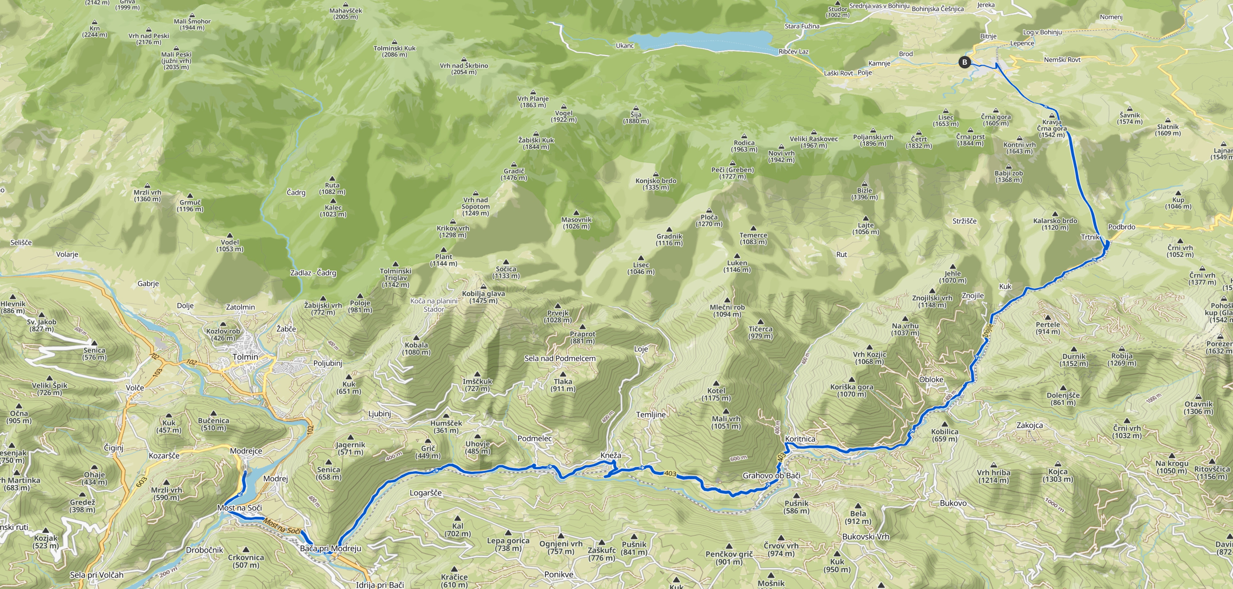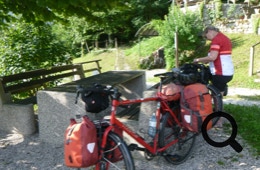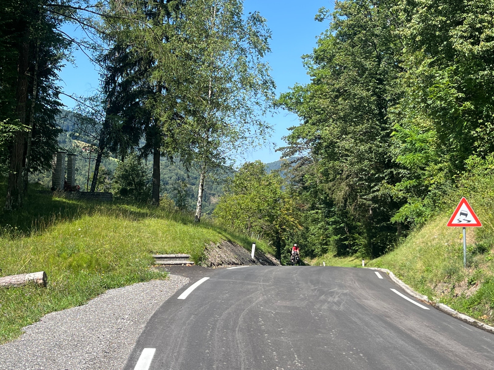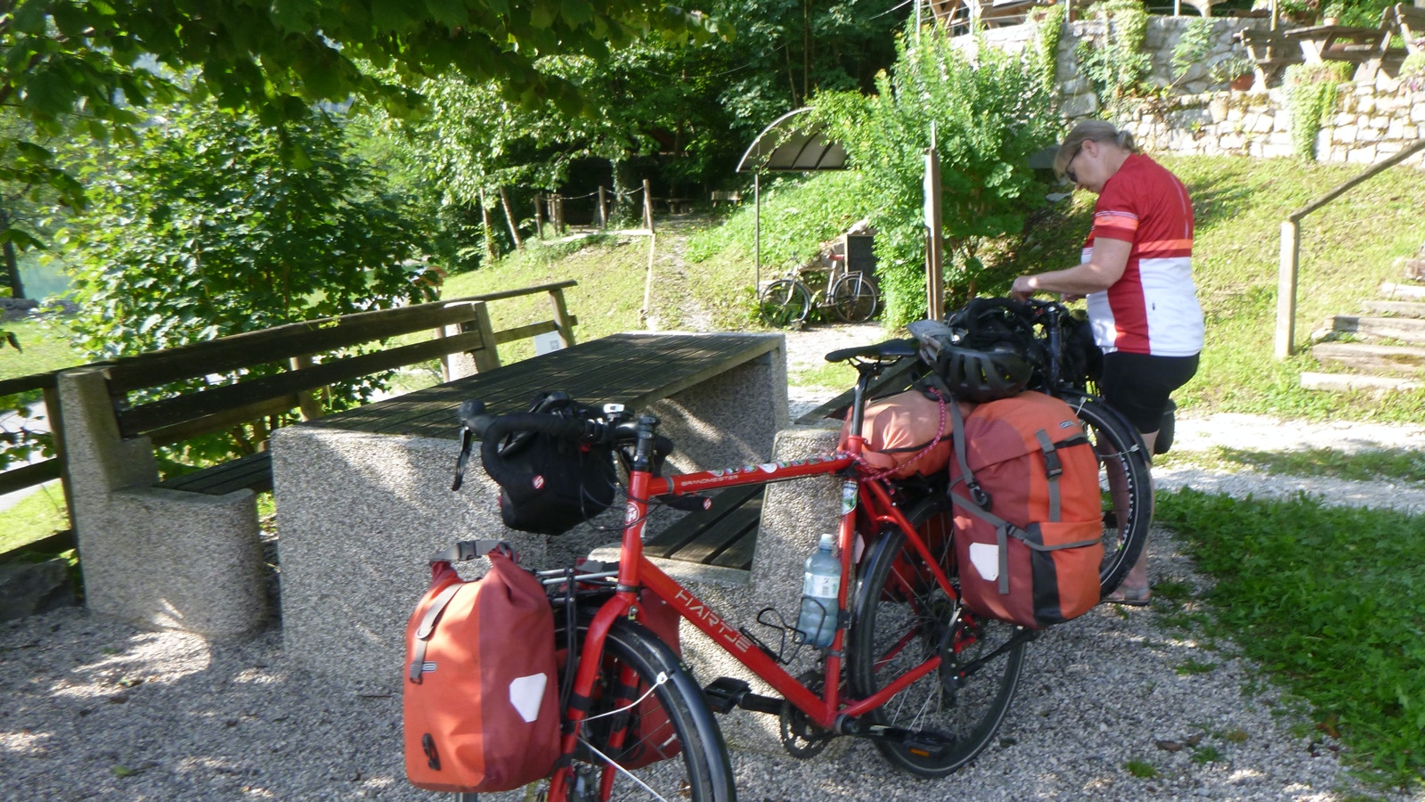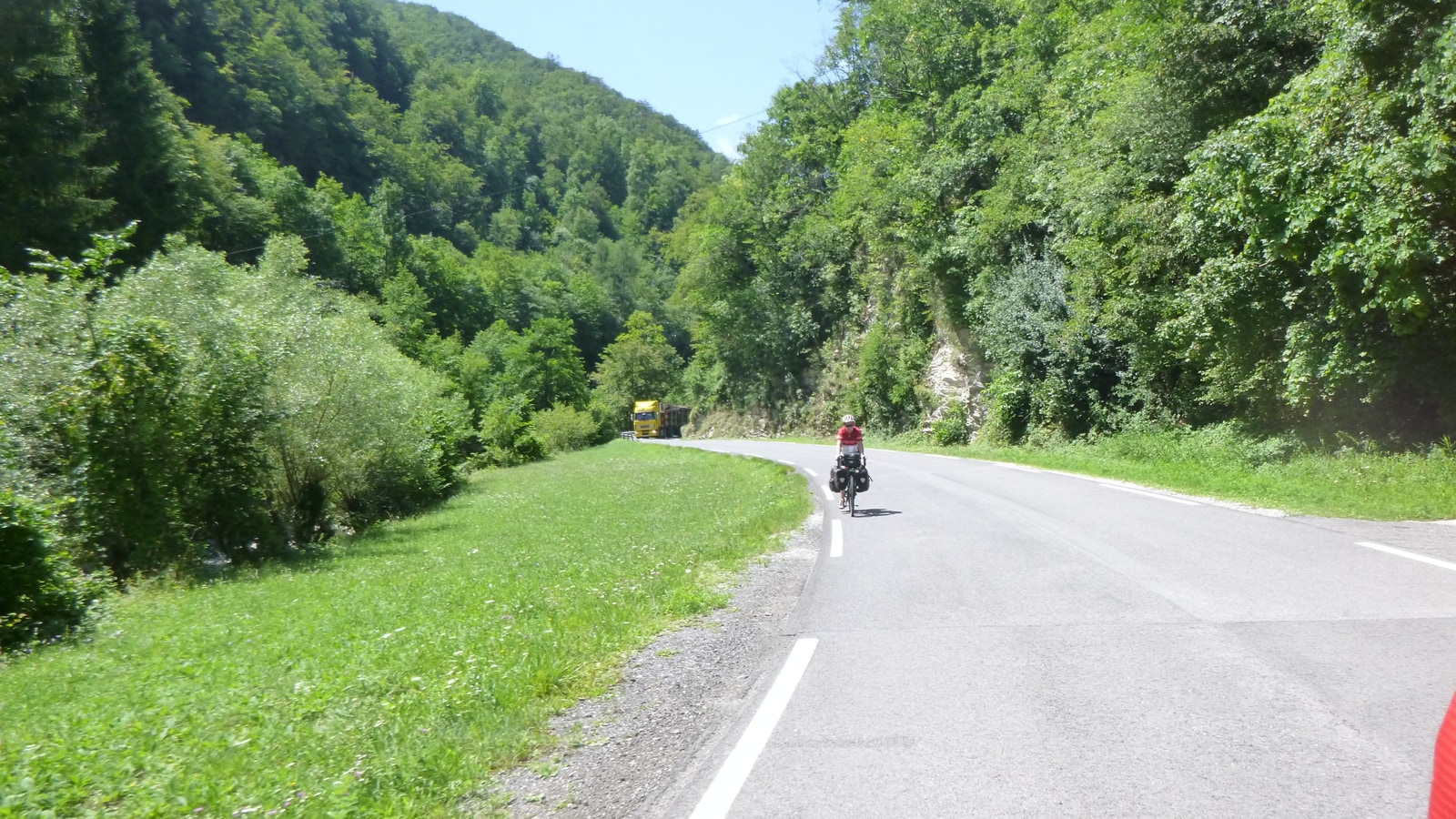 Anschließend geht es durch das Tal der Bača. Hier herrscht sehr wenig Autoverkehr, LKW sind nur als Anlieger erlaubt. Die Gegend ist sehr schön und grün, die Steigung moderat und kaum zu spüren.