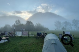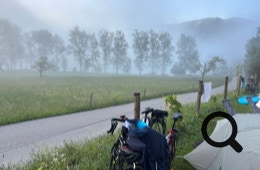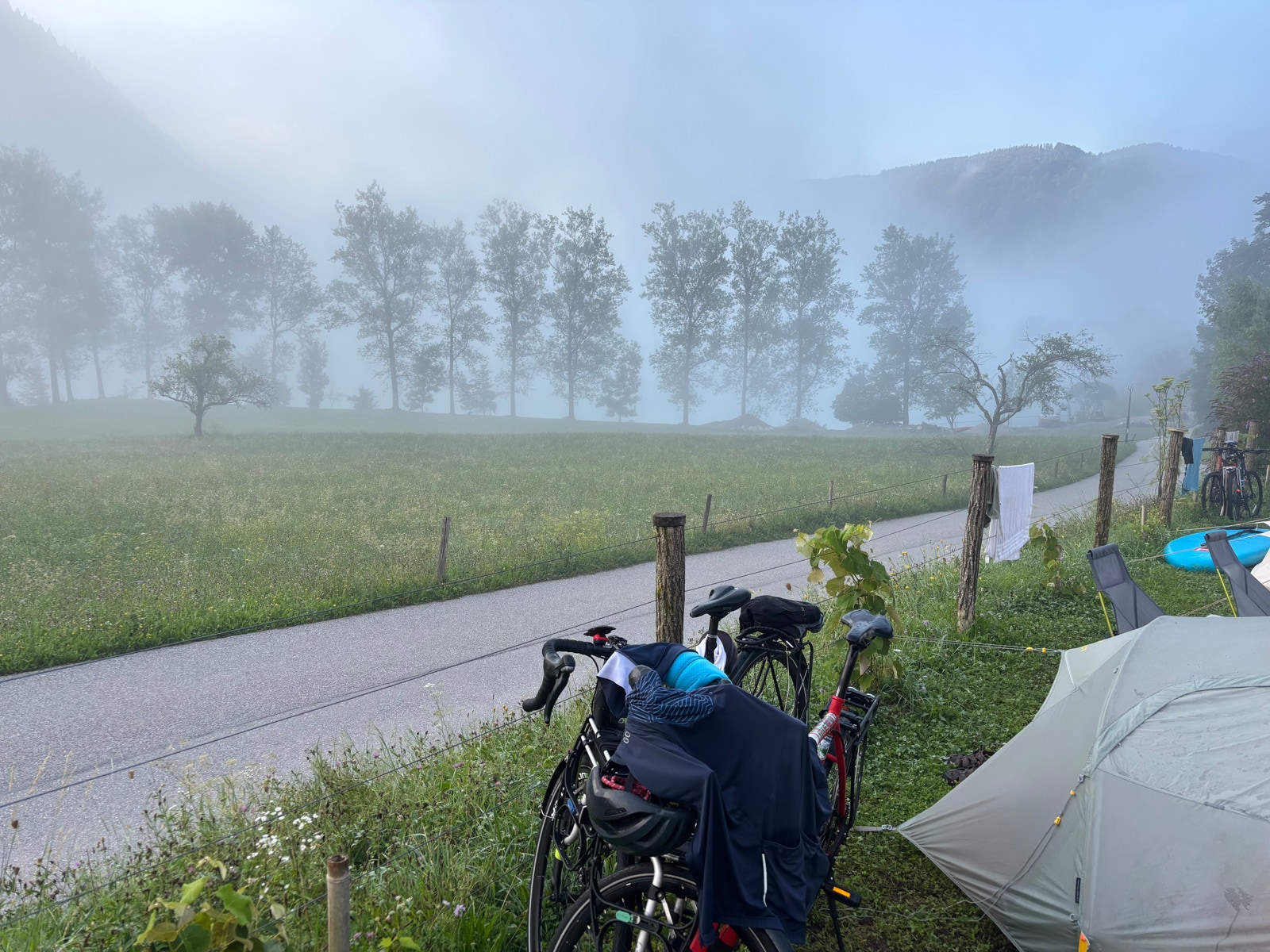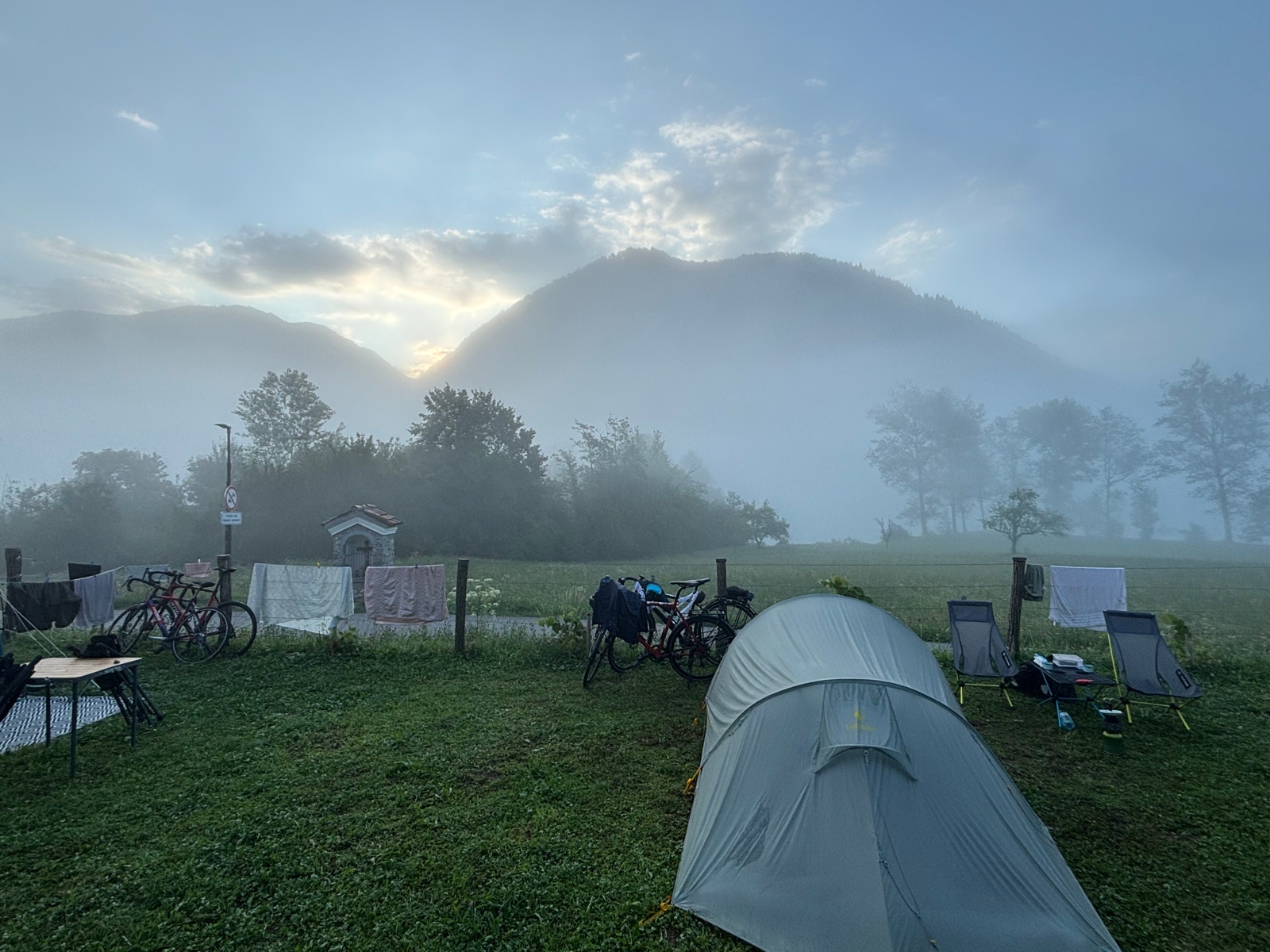 Die Nacht war sehr ruhig und um sechs Uhr sind wir die ersten, die aufstehen. Der Himmel ist bedeckt und Nebel liegt malerisch über dem See. Während wir Kaffee trinken, dabei das Zelt abbauen und alles zusammenpacken, klart es auf und wird warm.