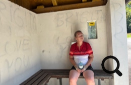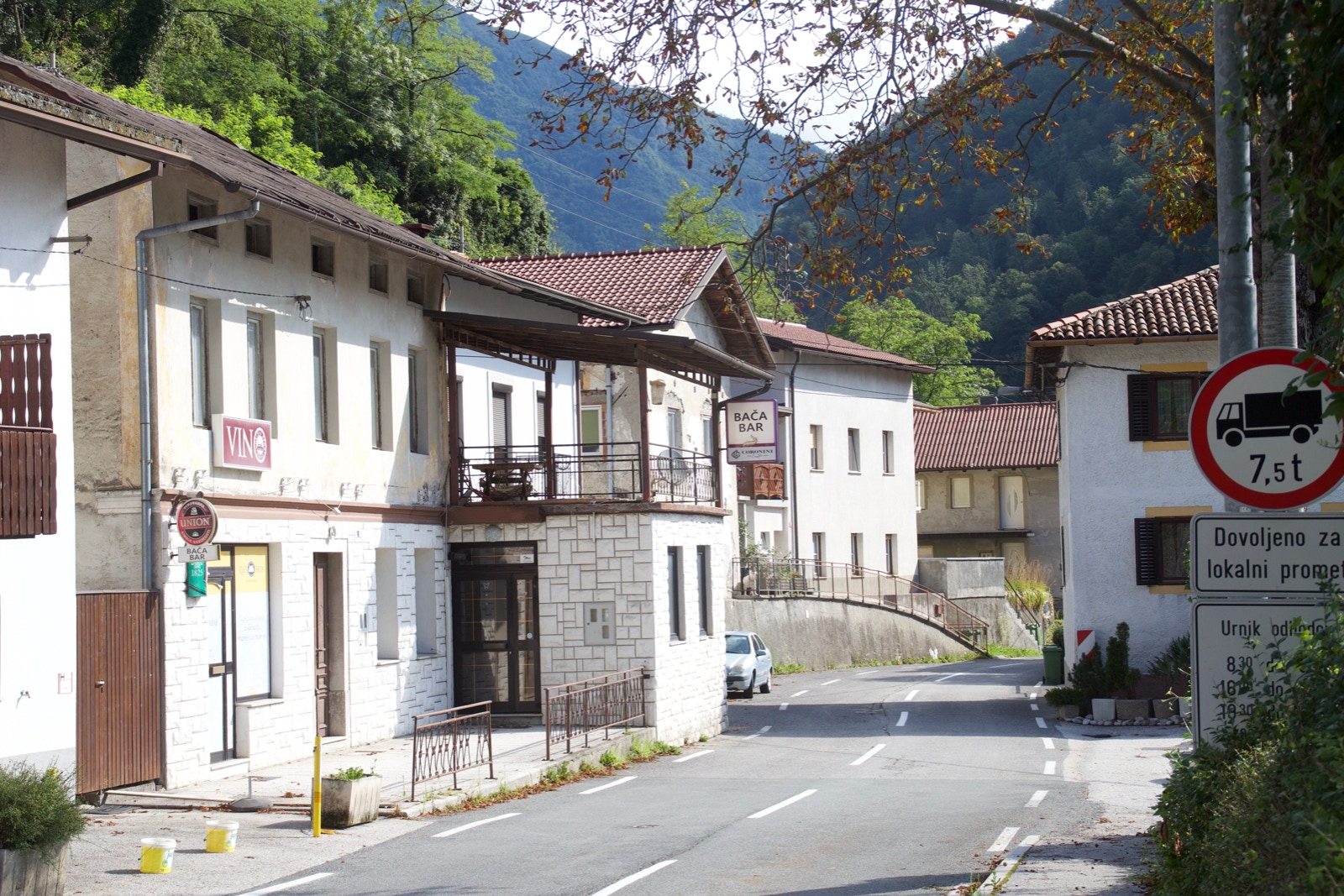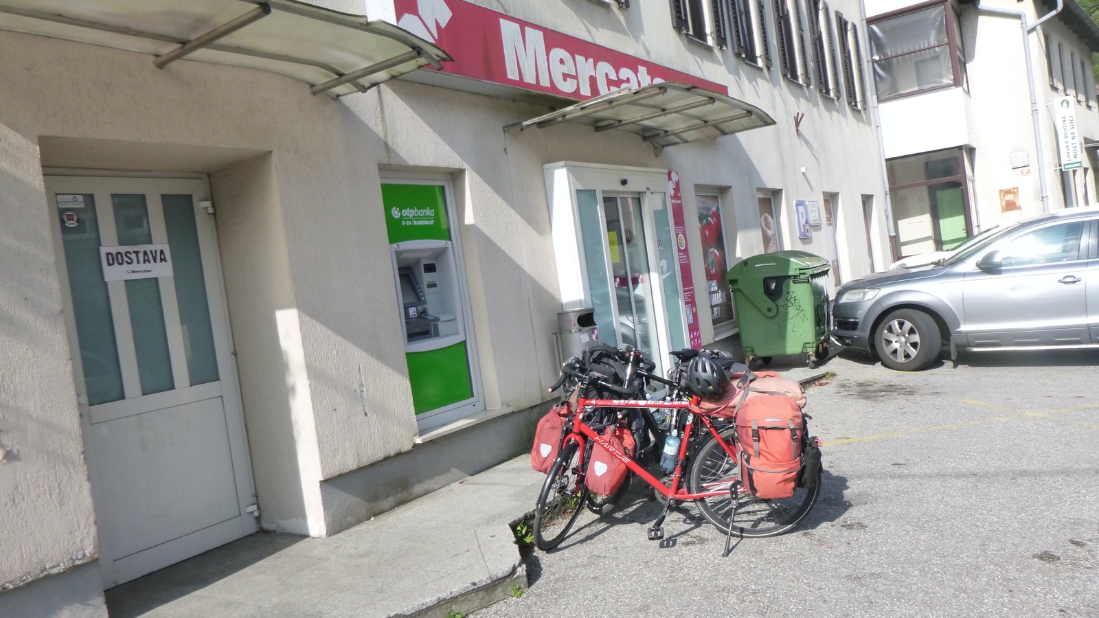 Um kurz vor neun machen wir uns auf den Weg. Zunächst kaufen wir im örtlichen Supermarkt ein. Dann geht es weiter nach Bača pri Modreju, wo wir auf einer lauschigen Bank frühstücken.