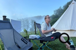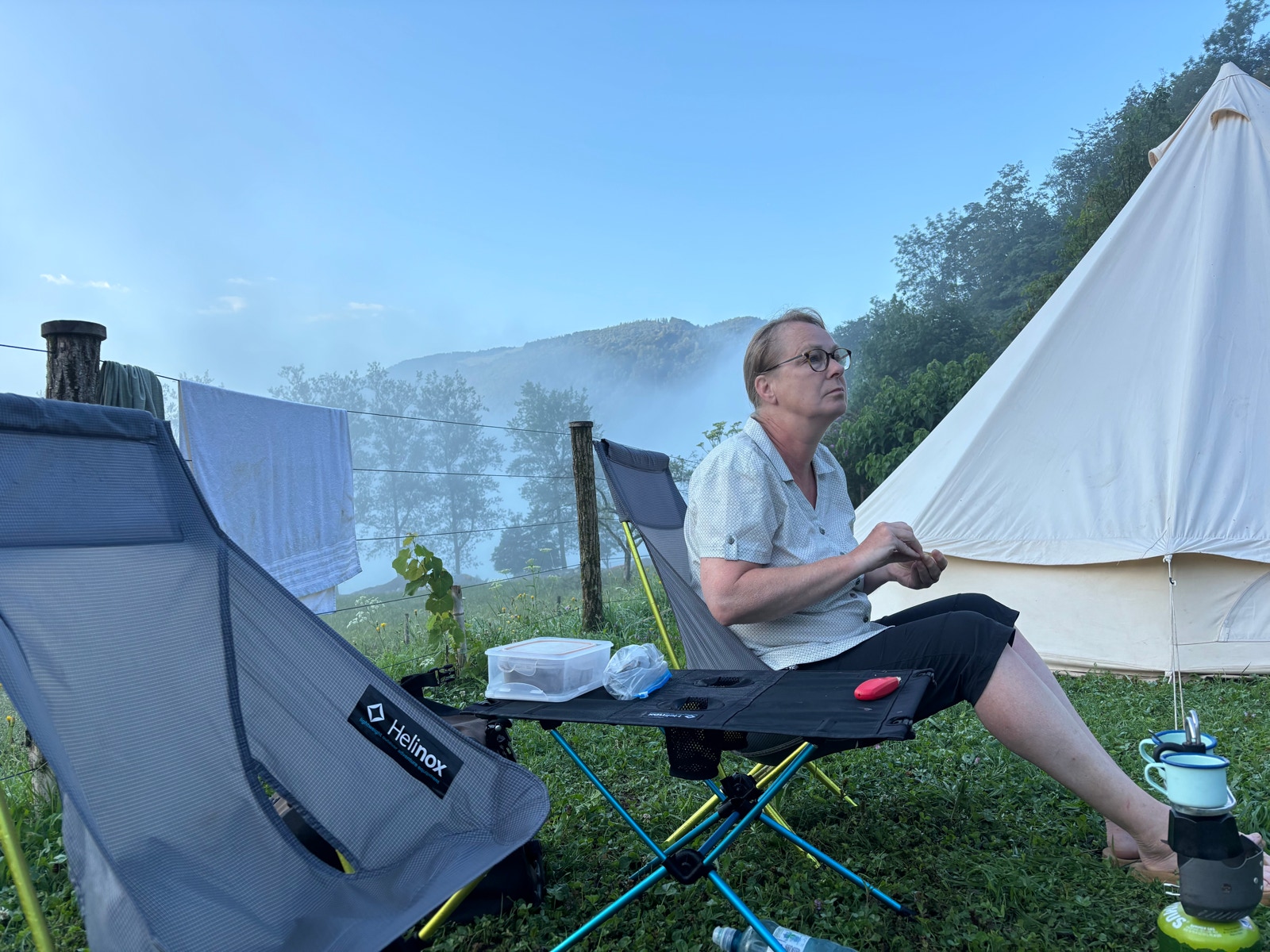 Es ist nicht weit, wir checken für zwei Tage ein. Das Zelt lassen wir erstmal zu Ende trocknen, bevor wir fertig aufbauen und einräumen.