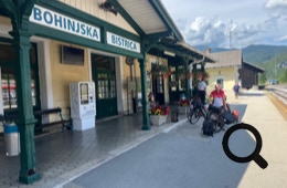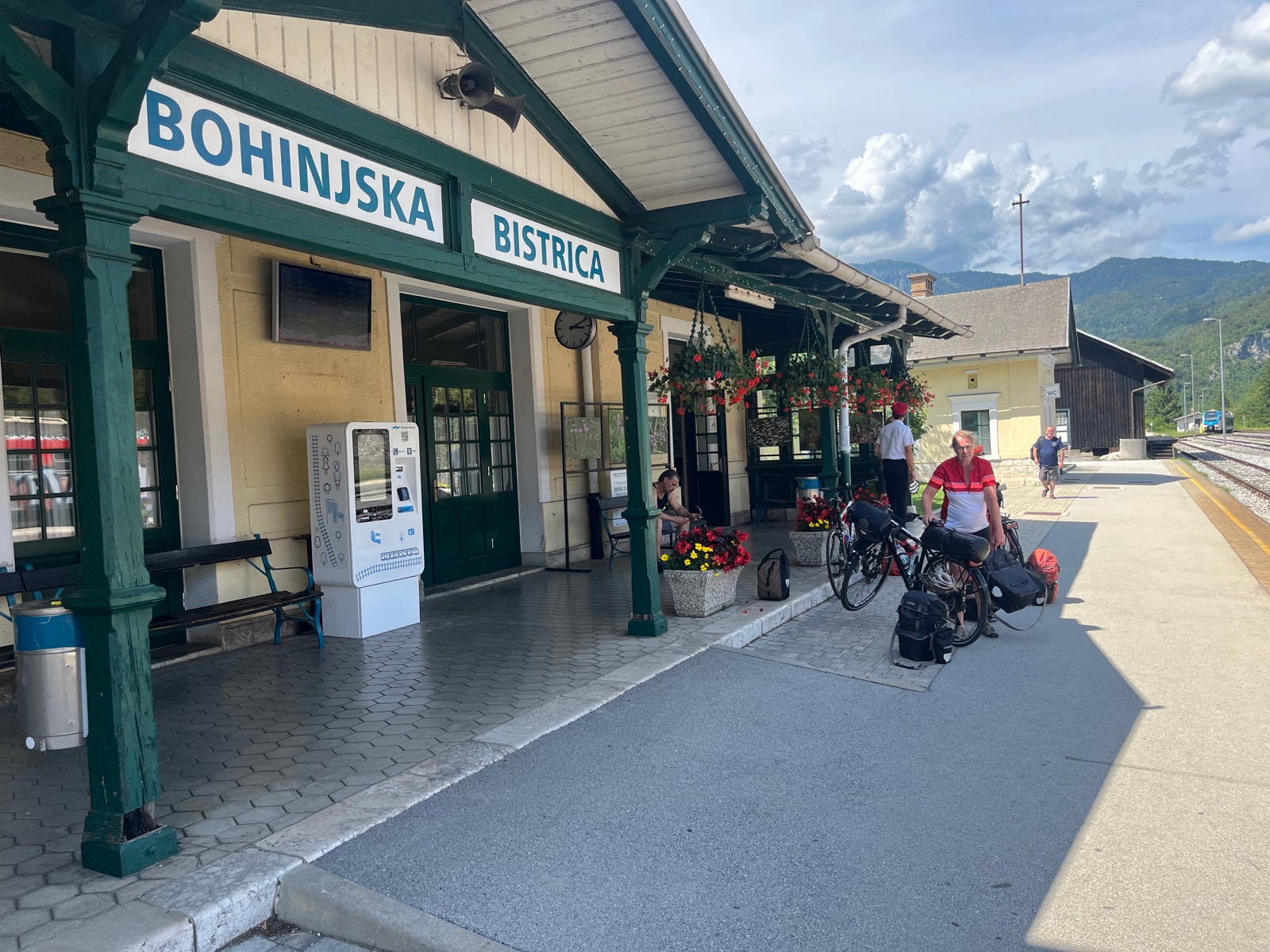 Nach zehn Minuten sind wir am Bahnhof von Bohinjska Bistrica, wo wir an einer Pizzeria erstmal etwas Eiskaltes trinken. Dabei disponieren wir um und beschließen, nicht nach Ukanc zu fahren, sondern den Campingplatz hier vor Ort zu nehmen.