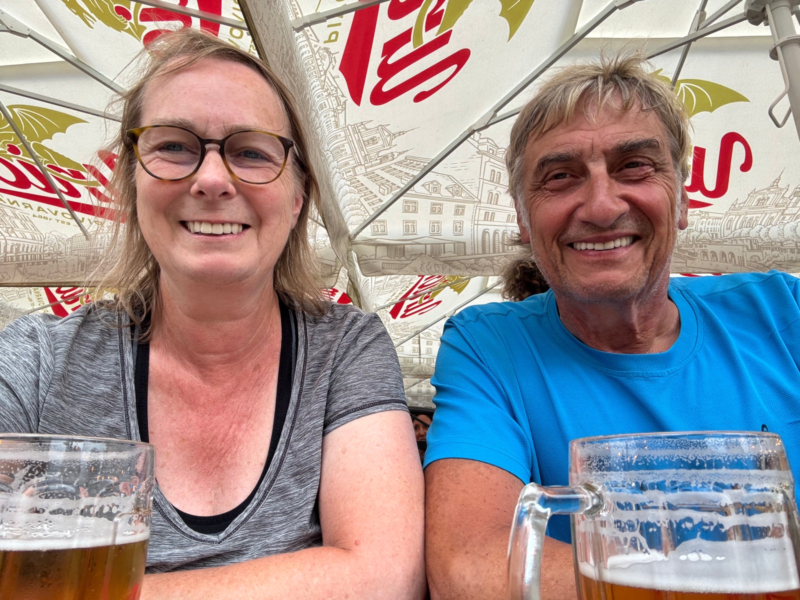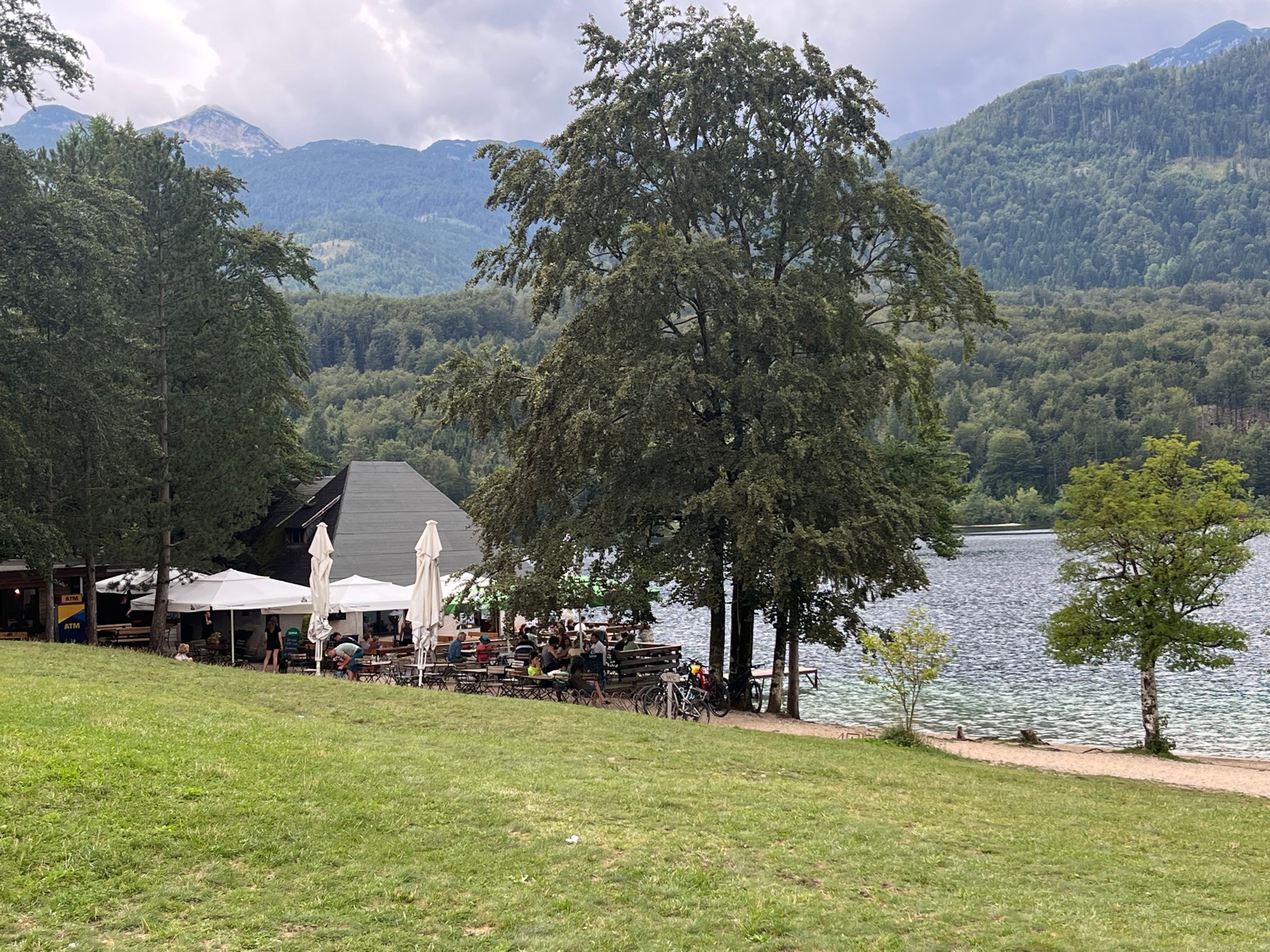 Wir nehmen Platz für eine Erfrischung, da beginnt es zu tröpfeln. Wir rücken unter den Schirm und lassen es uns gut gehen, während die Badegäste vom See im Platzregen zu ihren Autos rennen.