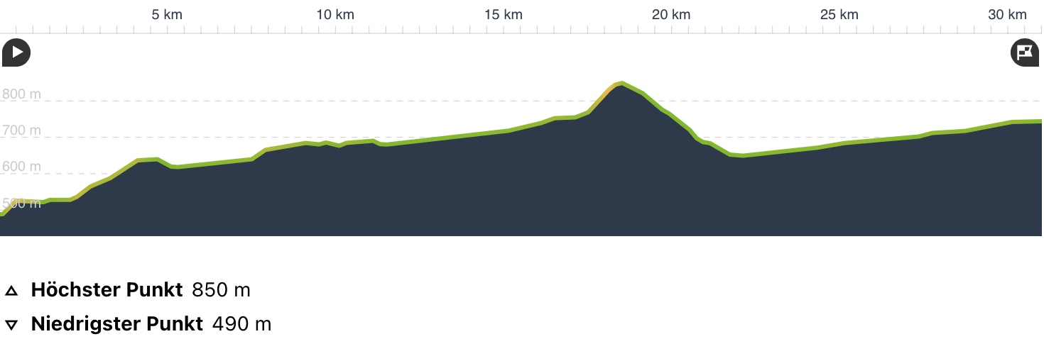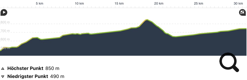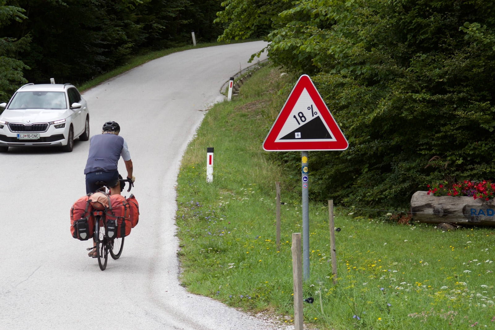 Dann kommt der Sattel: Es geht zunächst eine 17 %ige Steigung hoch und das ziemlich weit. Einige Radfahrer schieben ihr Rad hoch.