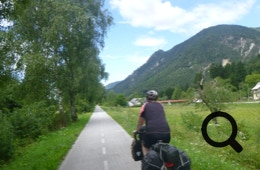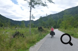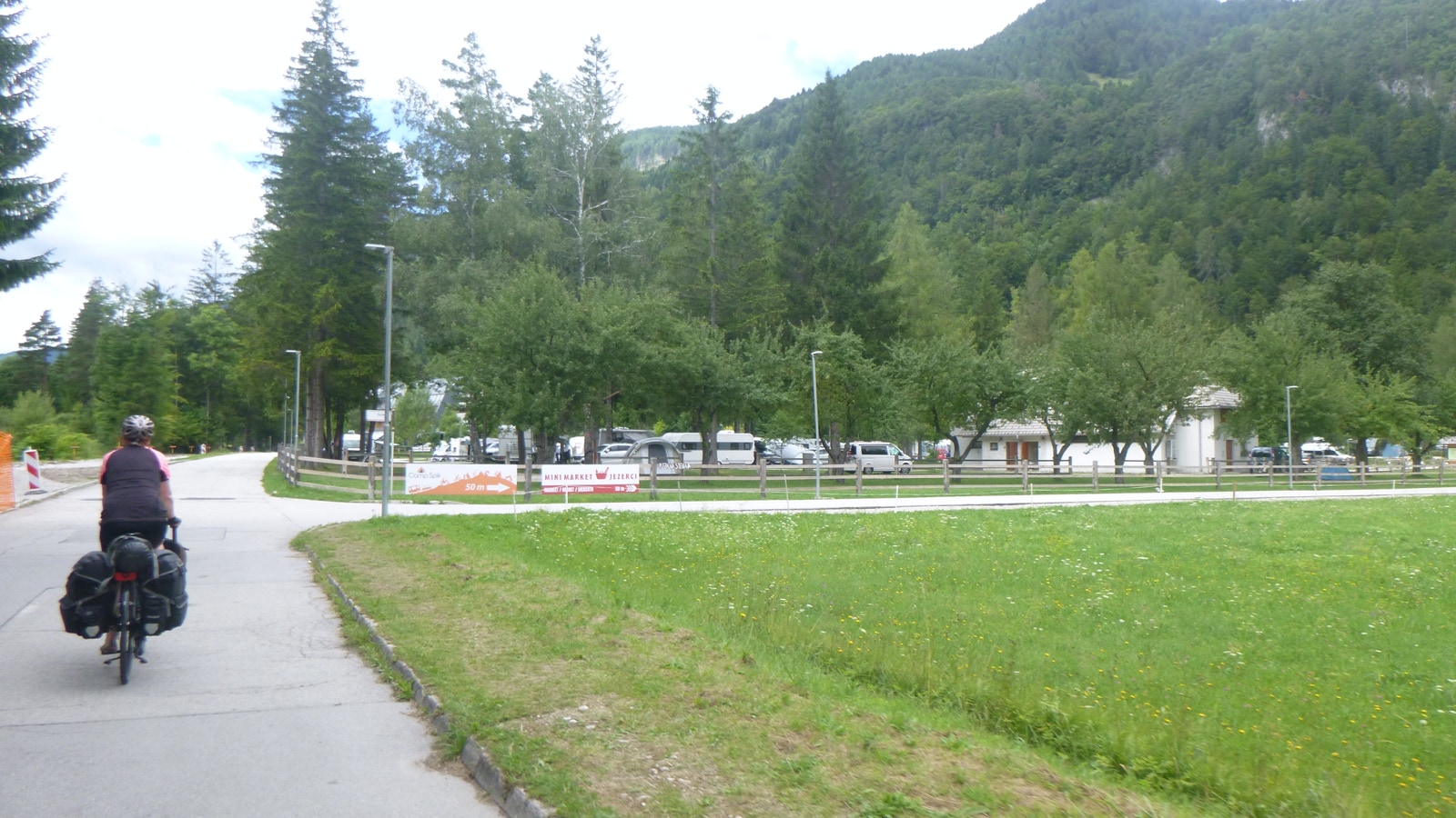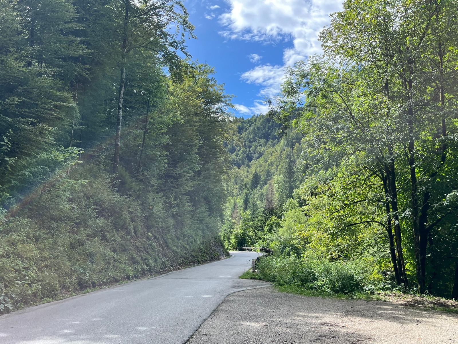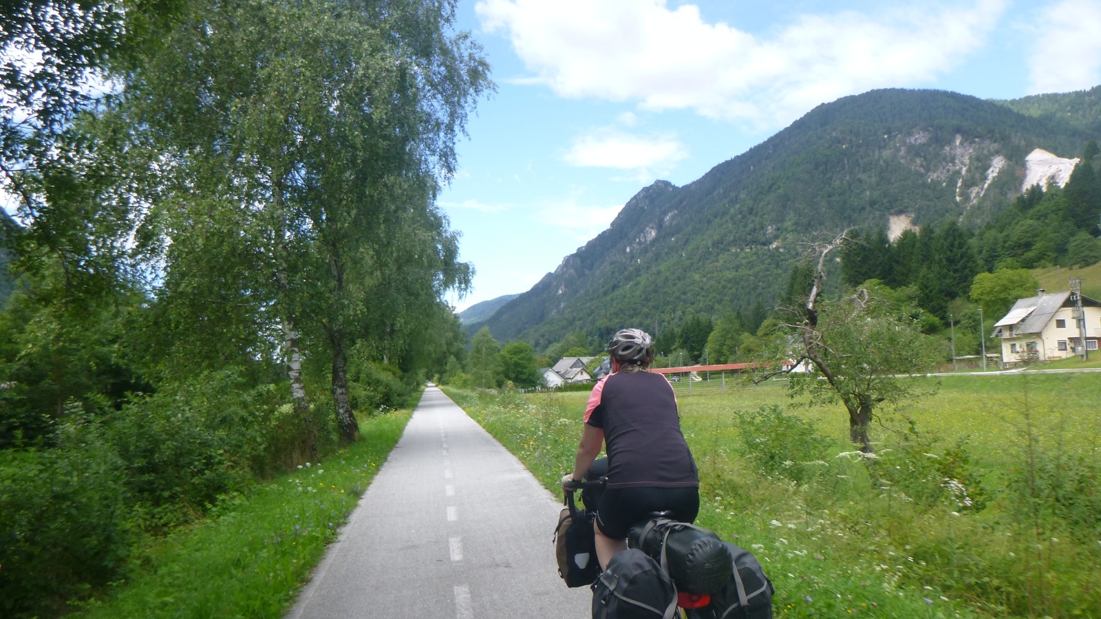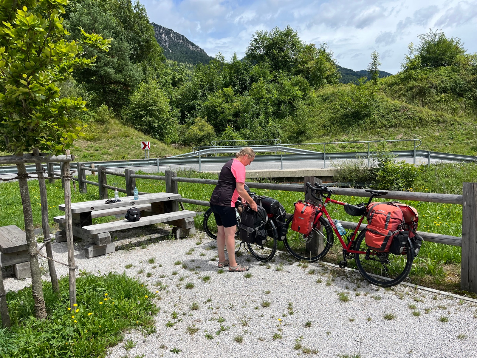Es sind heute viele Radfahrer unterwegs, teils in Gruppen, Familien oder Paare mit Gepäck. Das ändert sich auch nicht, als wir in den Nationalpark „Triglav“ kommen. Hier geht es fast flach durch dichte Wälder mit wenig Autoverkehr.