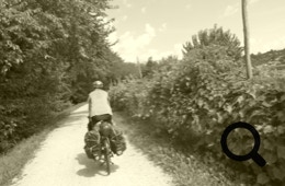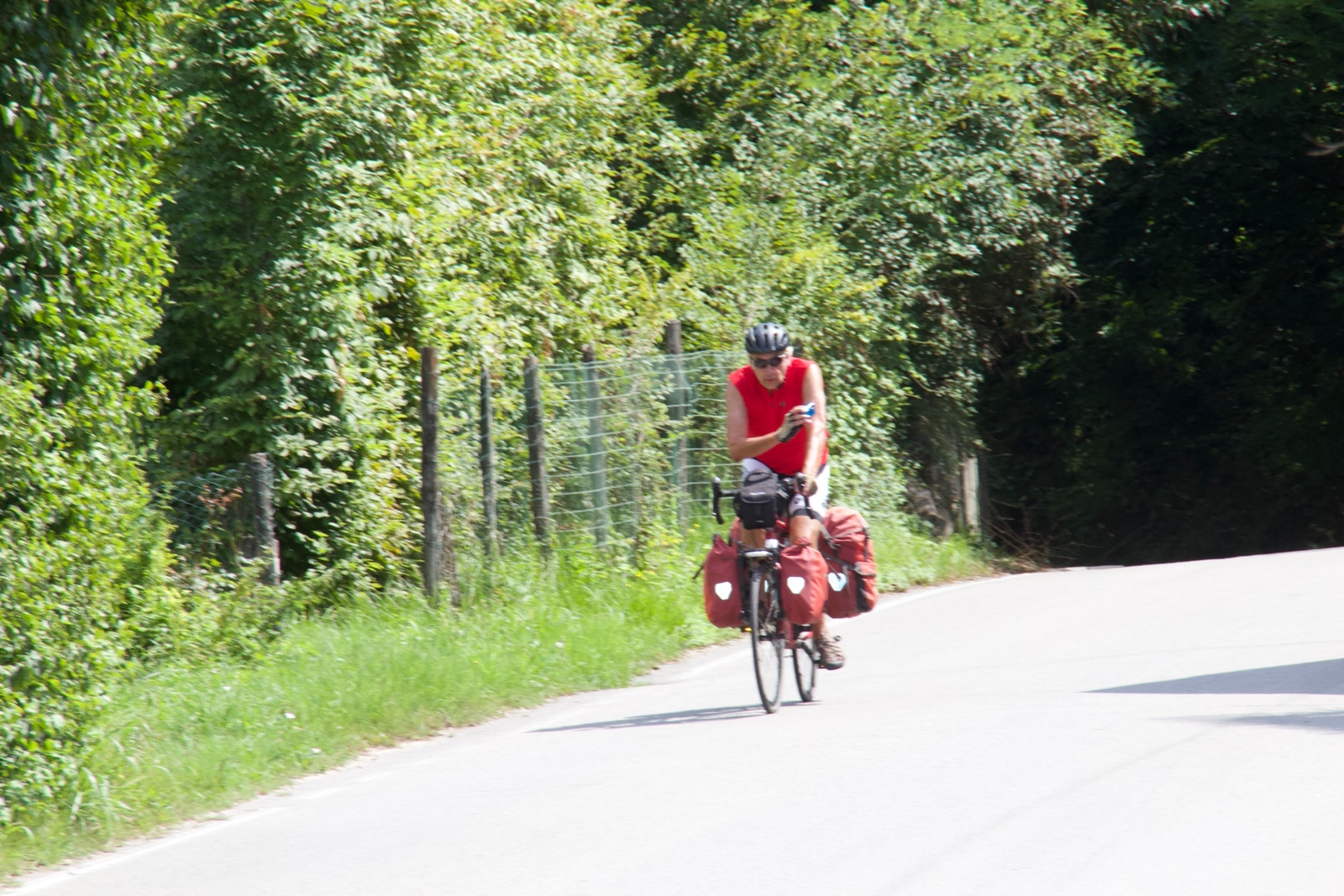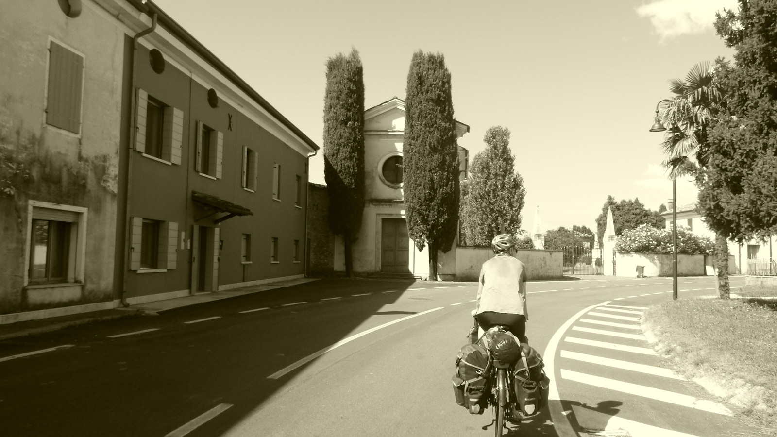 Dann geht es eine wenig befahrene Straße hinab nach Casella d’Asolo. Zwischendurch werden wir immer wieder von kleinen und auch größeren Gruppen von Rennradfahrern überholt, die uns zuwinken und die Daumen drücken. Bergab ist auch Klaus’ Fahrrad brav. In Richtung Pagnano müssen wir leicht bergauf und schon knackt die Kette wieder wild los.