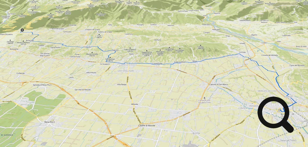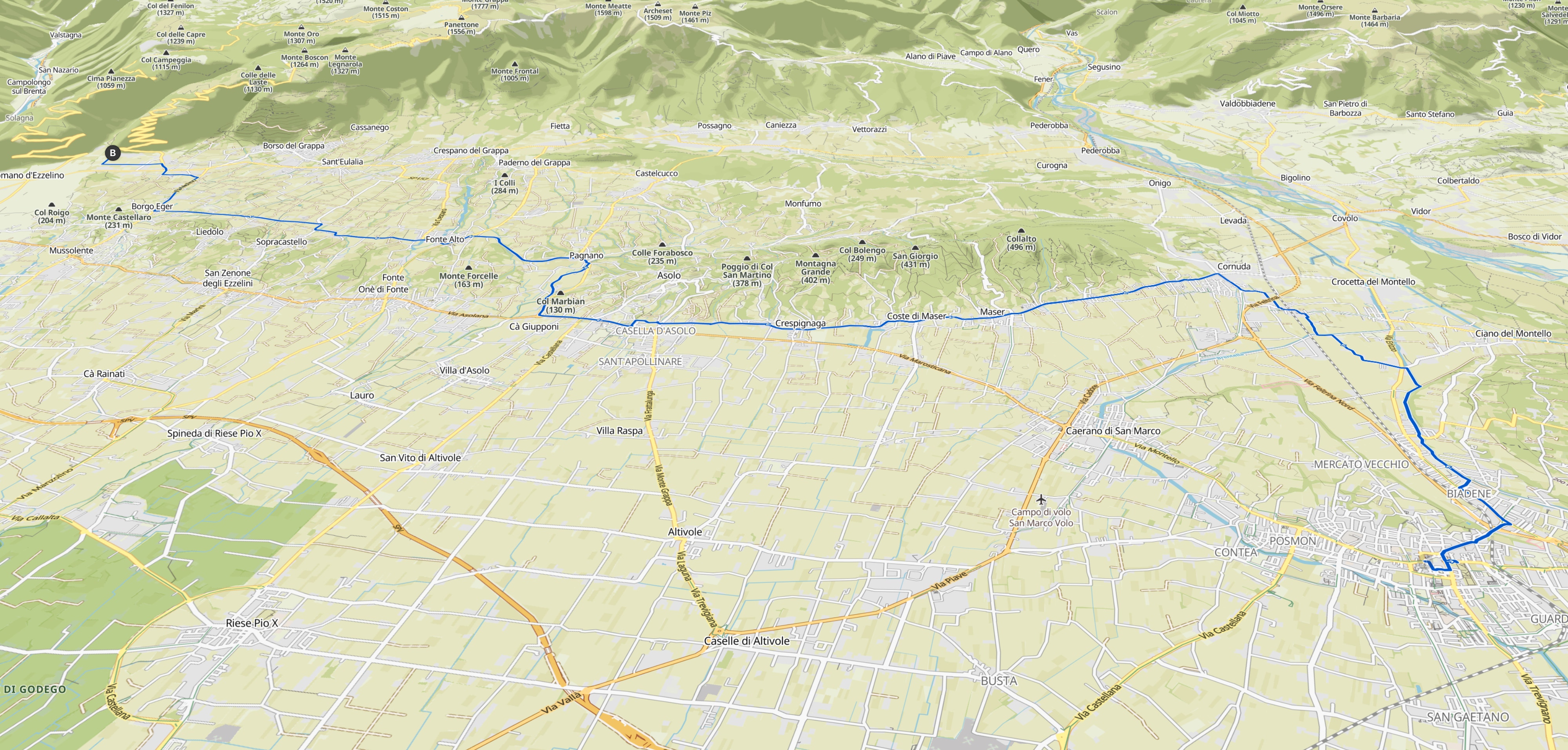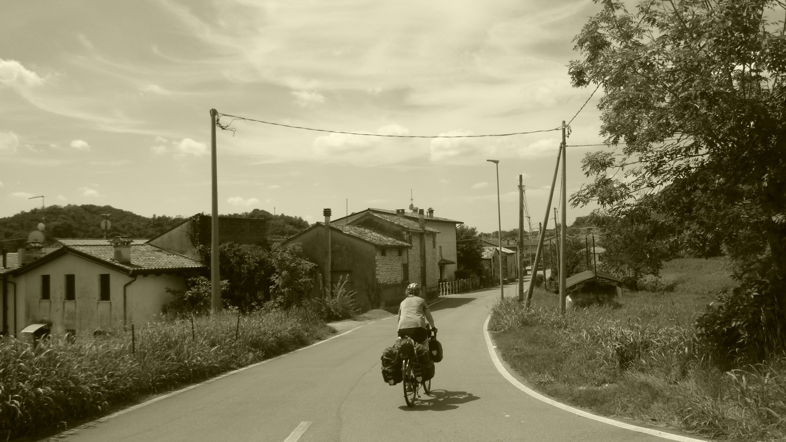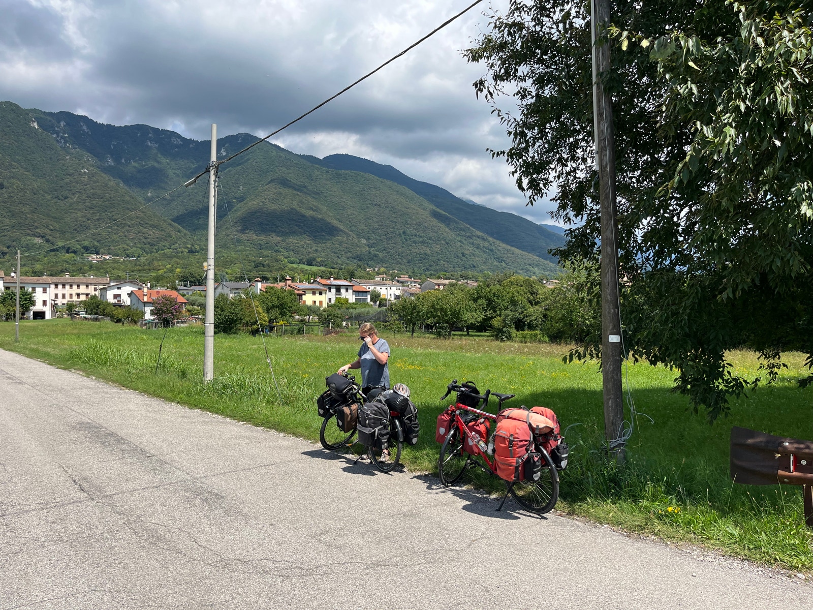 Heute führt unser Weg zunächst wieder durch die Stadt zurück auf den Radweg, der am Kanal entlangführt. Hinter Caonada verlassen wir diesen Weg und fahren bis Cornuda eine schöne Strecke über Felder und kleine Ansiedlungen.