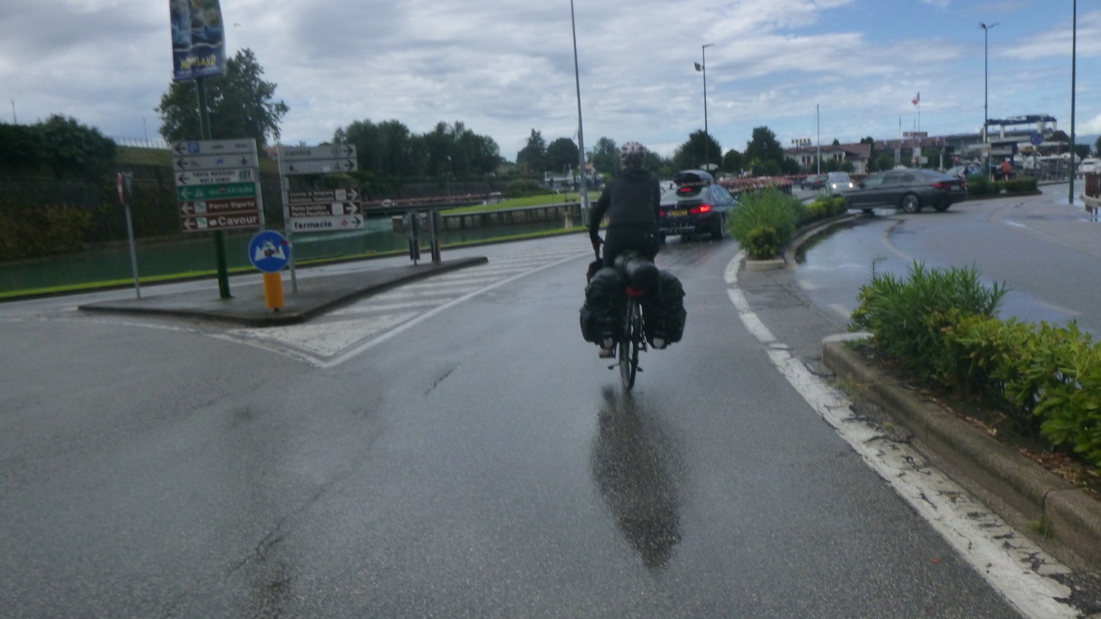 Nachts hat es mal kräftig geregnet, aber als wir aufstehen, ist es trocken. Wir frühstücken im Hotel, holen unsere Räder aus der Garage und beladen sie, während es wieder zu regnen beginnt.