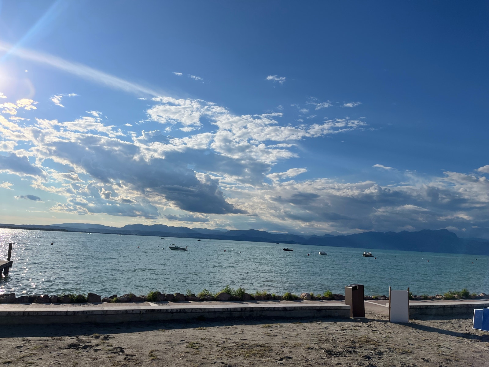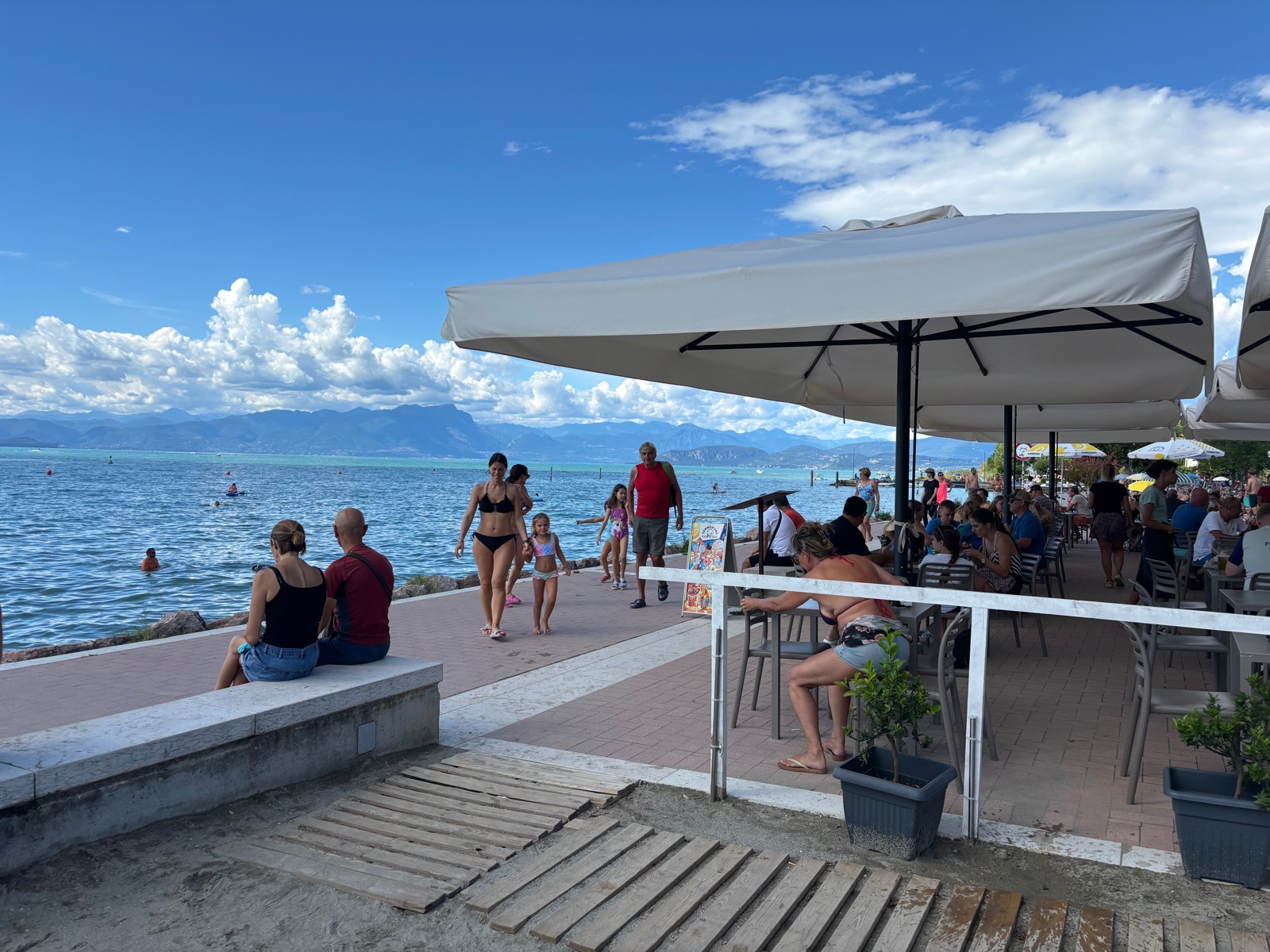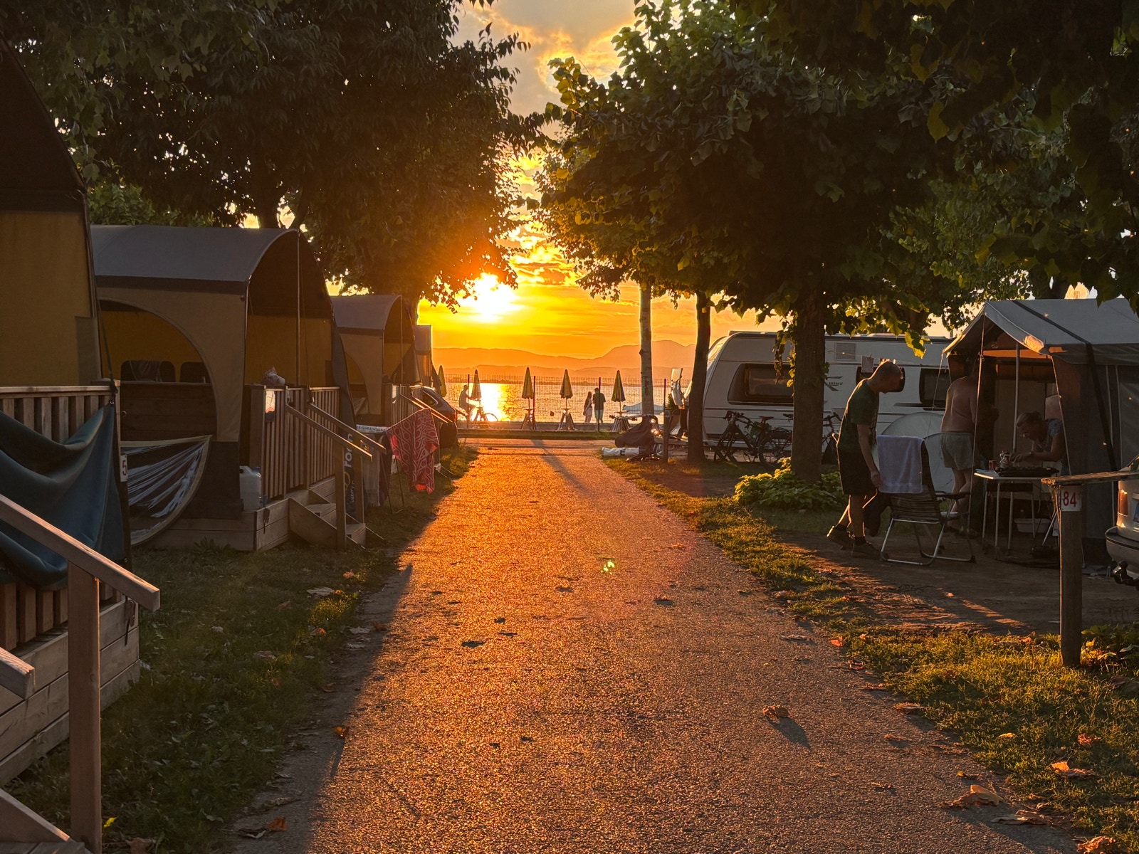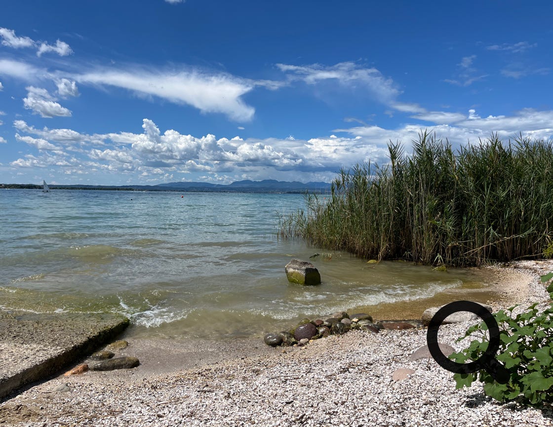 Da die Sonne so schön warm scheint, legen wir Badekleidung an und spazieren am Seeufer entlang. An einem seichten Uferstück gehen wir baden und trocknen uns auf der Wiese. Da Sonntag ist, wimmelt es nur so von Menschen, die auch hier baden wollen.