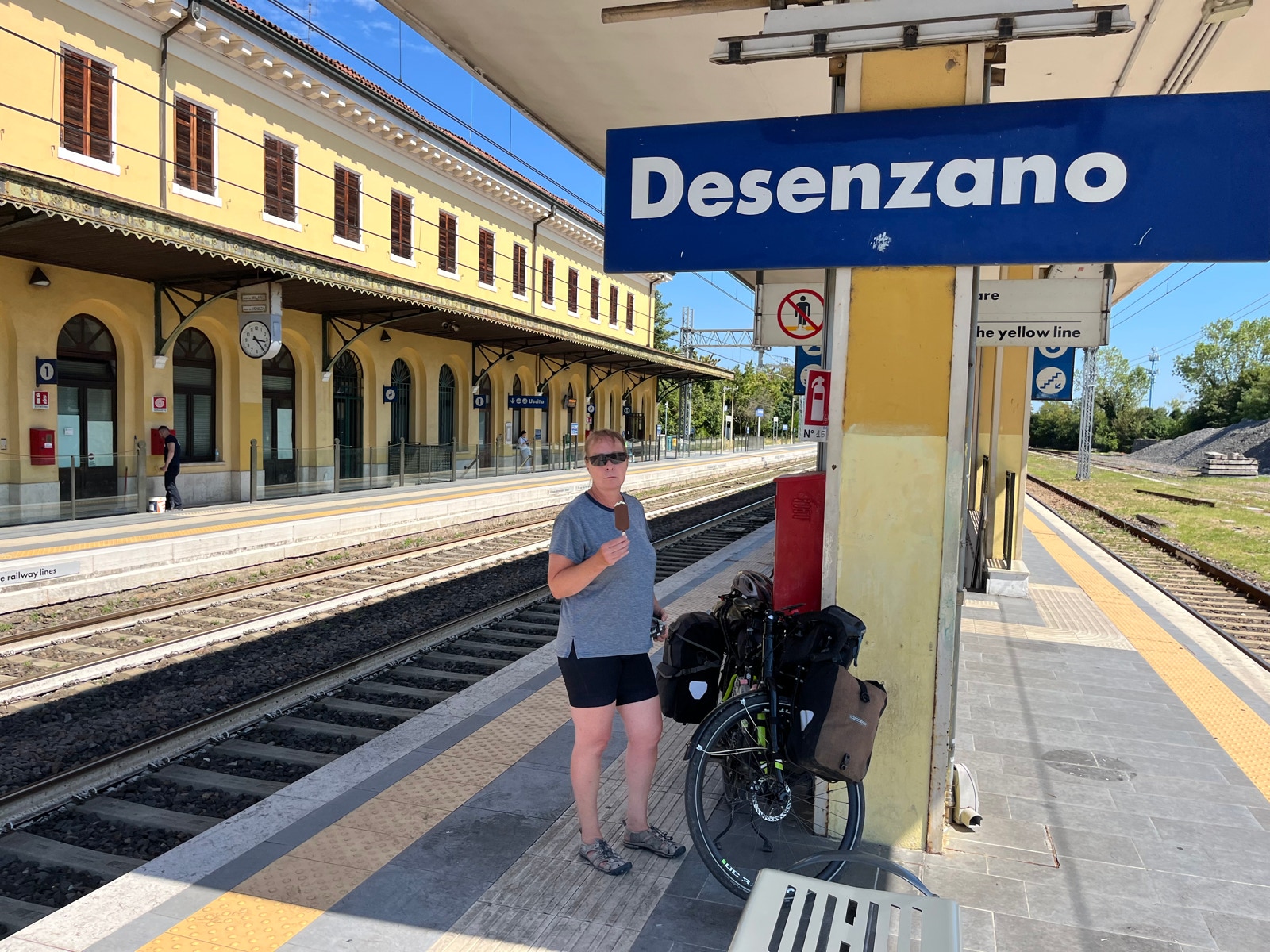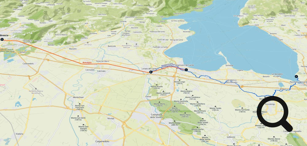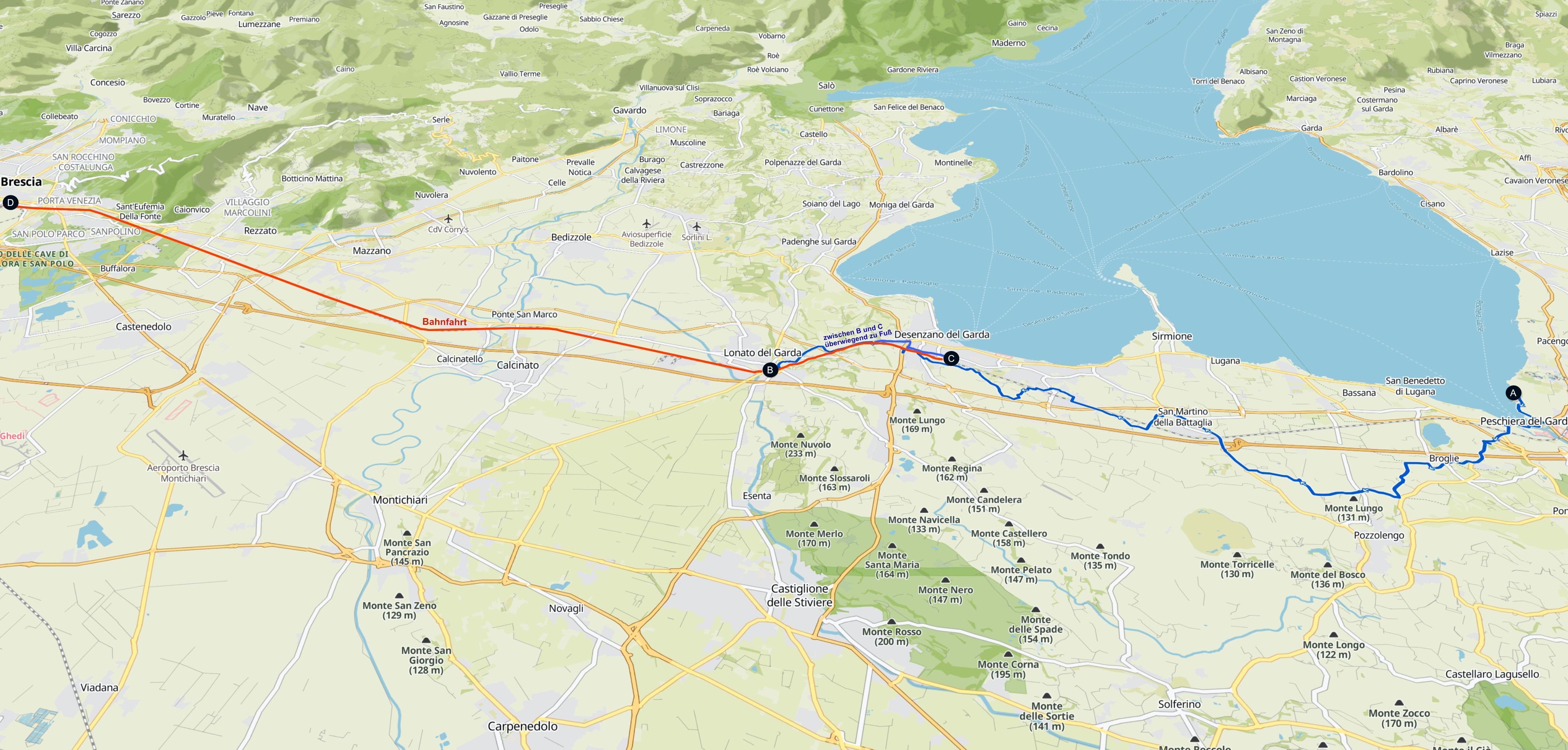 Wir beschließen, bis zum Bahnhof von Lonato zu schieben und dort die Bahn nach Breschia zu nehmen. Ganz schön anstrengend bei der Hitze, es sind ca. vier Kilometer.