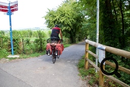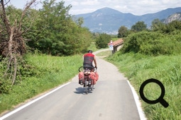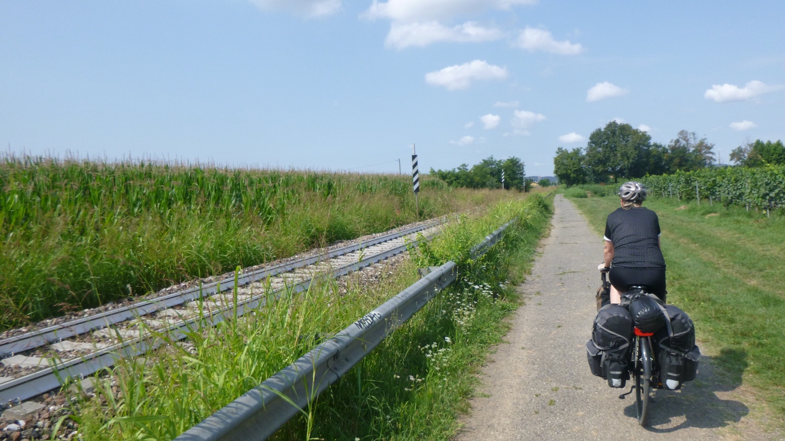 Unsere Fahrräder, die in einem nicht benutzten Nebenraum des Hotels abgestellt sind, beladen wir dort. Das ausgetauschte Laufrad muß nun auf das eh schon vorhandene Gepäck geschnürt werden, was lustig aussieht. Aber die Hauptsache ist, daß das Rad wieder fährt. Die Schaltung ist etwas unpräzise eingestellt, aber damit kann man einigermaßen leben.