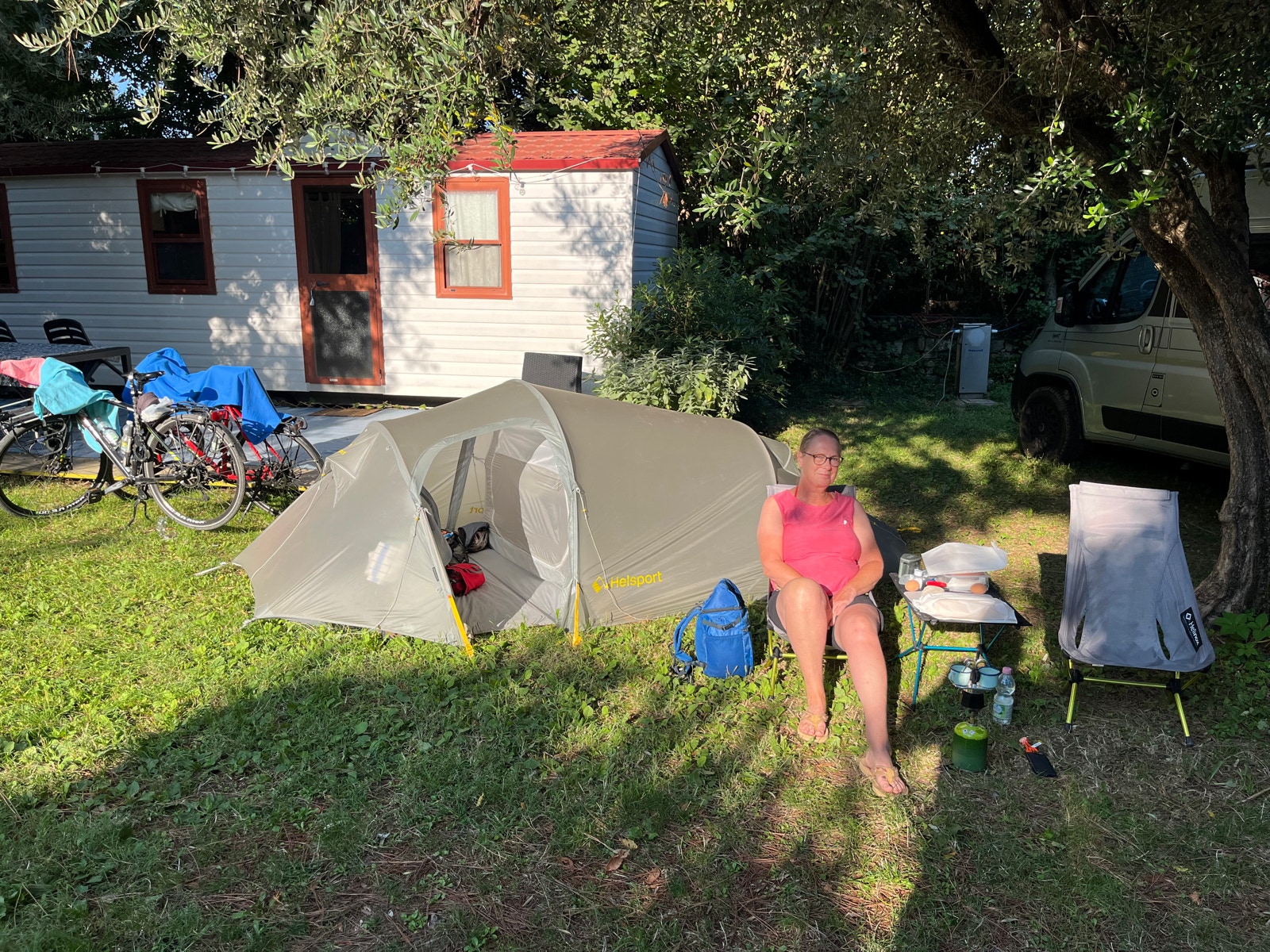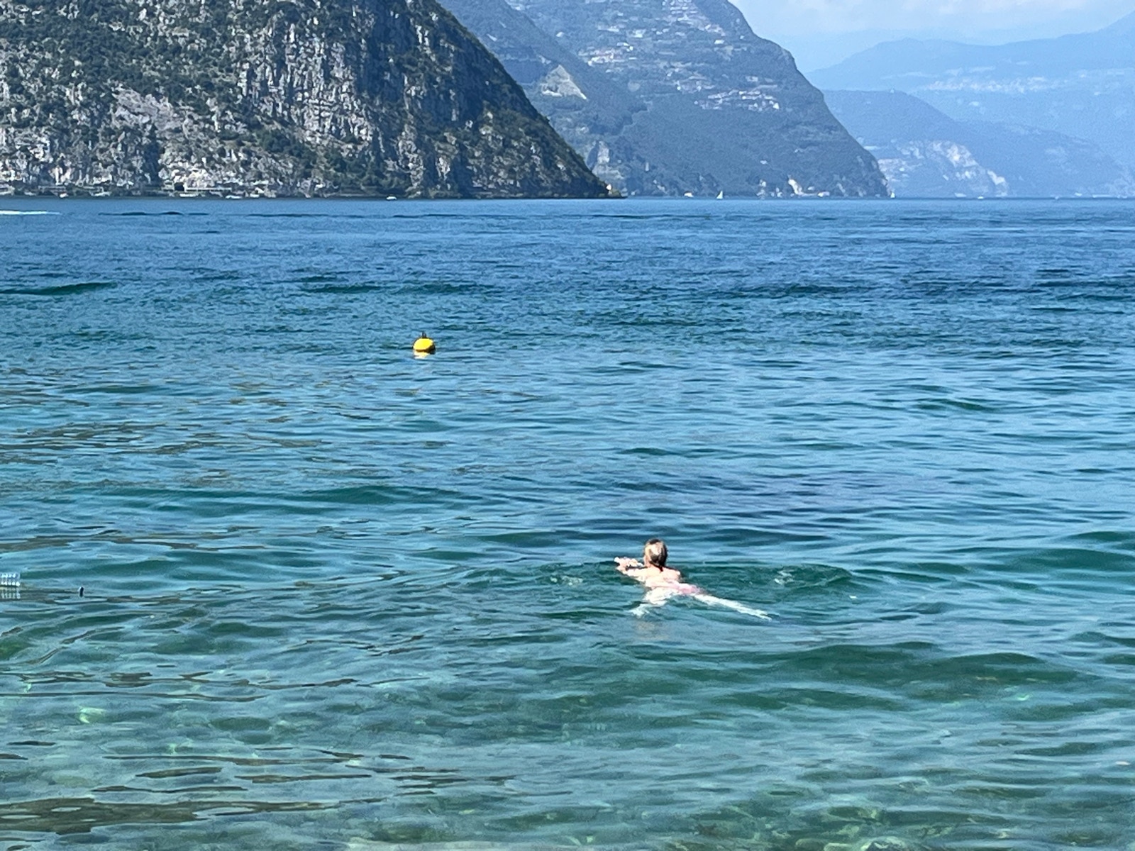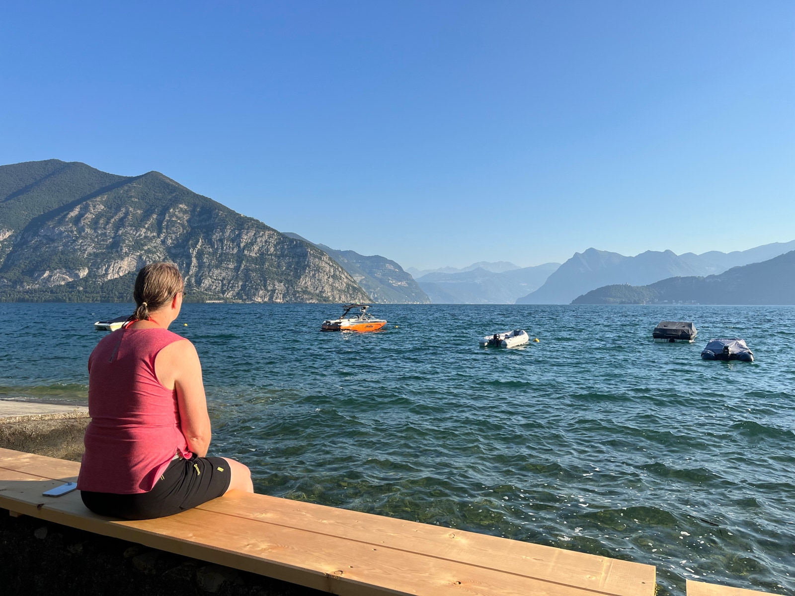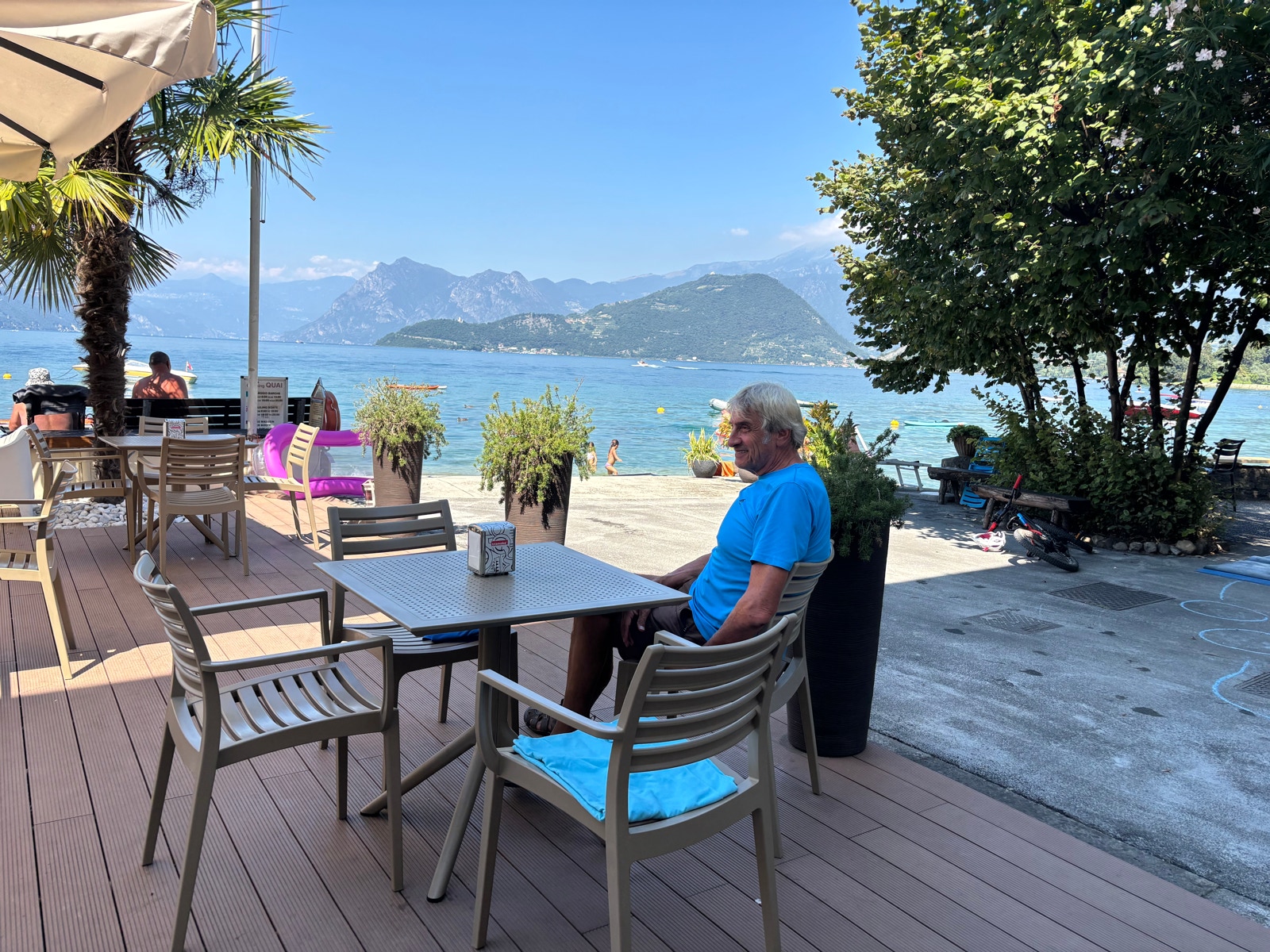 Mit den Fahrrädern fahren wir dann nach Iseo zum Einkaufen. Am Nachmittag setzen wir uns auf die Terrasse des Campingplatzes am See und genießen Sonne, Ausblick und kühle Getränke.
