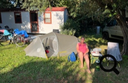 Da wir in dem Gartenplatz ganz für uns waren, hören wir vom Campingplatz nichts und können deshalb schlafen, bis uns die Müllabfuhr an der Straße weckt.